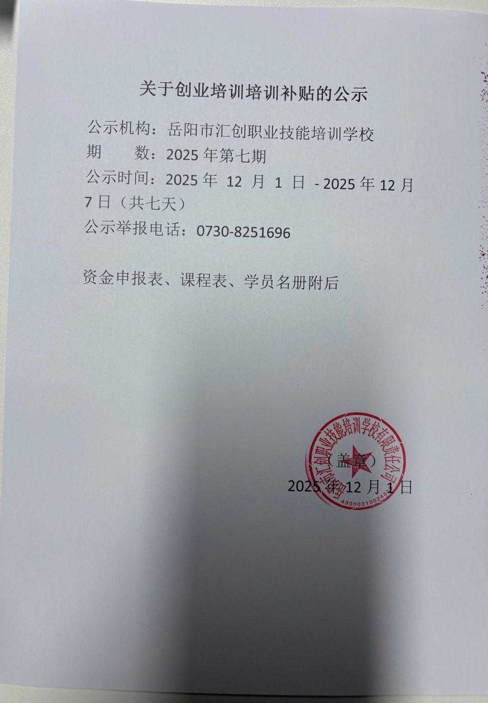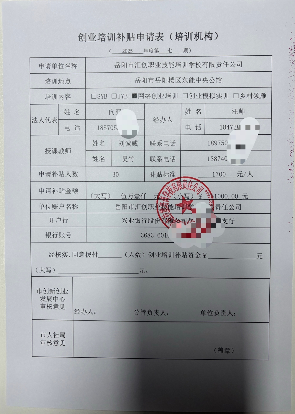 岳阳市汇创职业技能培训学校有限责任公司2025年第七期网络创业培训资金申请表、课程表、学员名册