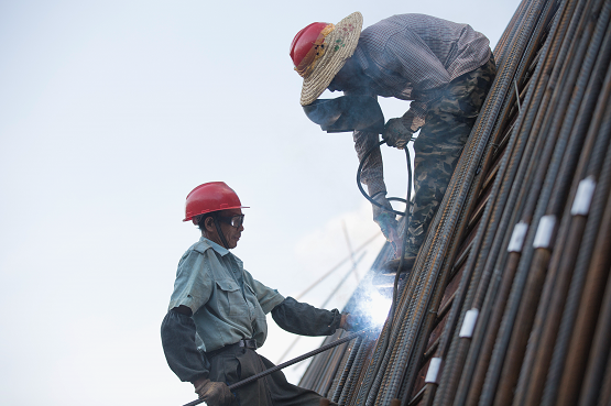 此时,豆大的汗珠从他的脸颊滴到滚烫的钢筋上,瞬间被蒸发,不过几分钟,汗水已经透湿了衣服。但即便如此,他也必须全神贯注地紧盯着焊点焊接,确保施工质量。