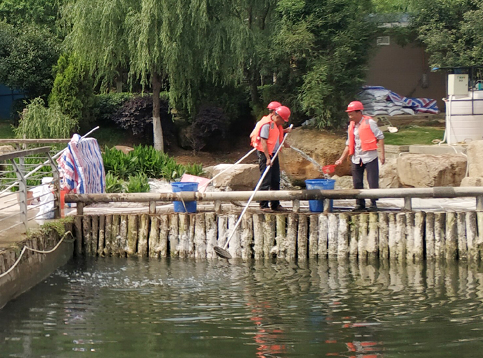 现场工作人员投放净化水体药剂