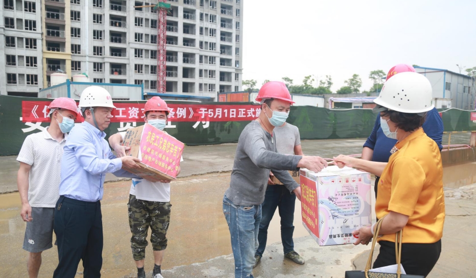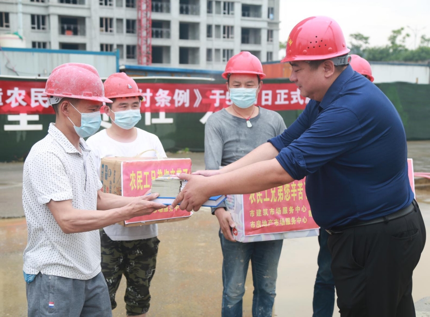 近日,市住建局党组成员、副局长葛文斌带领市建筑市场服务中心、市房地产市场服务中心党支部党员深入主城区进行房地产项目调研,开展党员先锋日活动,宣传5月1日正式实施的《保障农民工工资支付条例》。一行人先后来到岳茂苑、集美东方、龙庭尚府等项目,每到一个地方,都详细了解各项目施工、销售、运营等情况,下沉到施工现场为农民工兄弟们送去口罩3000余个、手套2000余双,并现场发放《保障农民工工资支付条例》手册1000本和《建设法律法规汇编》、《建筑业农民工常识读本》、《建设施工常见伤害及防护》等书籍和宣传单,询问在建工地农民工学校创建情况及农民工用工现状,解答相关条例内容和农民工关心的问题,帮助农民工提高法律维权意识。