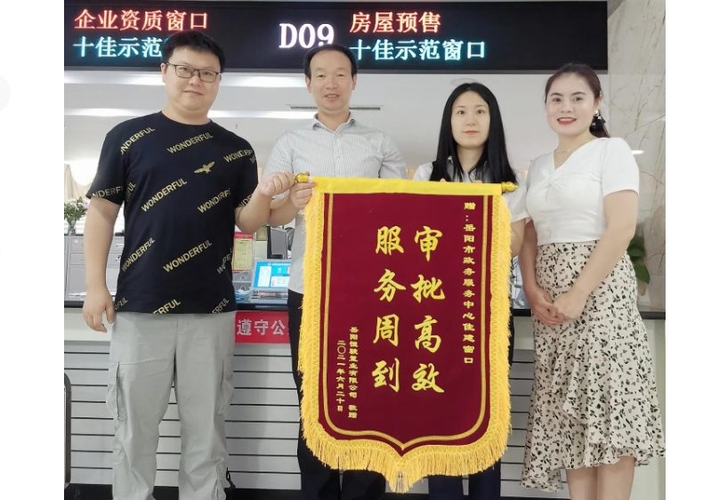 近日,岳阳某房地产公司将一面印有“服务热情周到 工作快捷高效”的锦旗赠予岳阳市房地产市场服务中心房屋预售窗口,感谢他们为房地产企业办理预售许可、房地产资质新申报、延期、升级、变更,项目资本金储存与解控等业务中给予工作支持和专业、高效的服务。