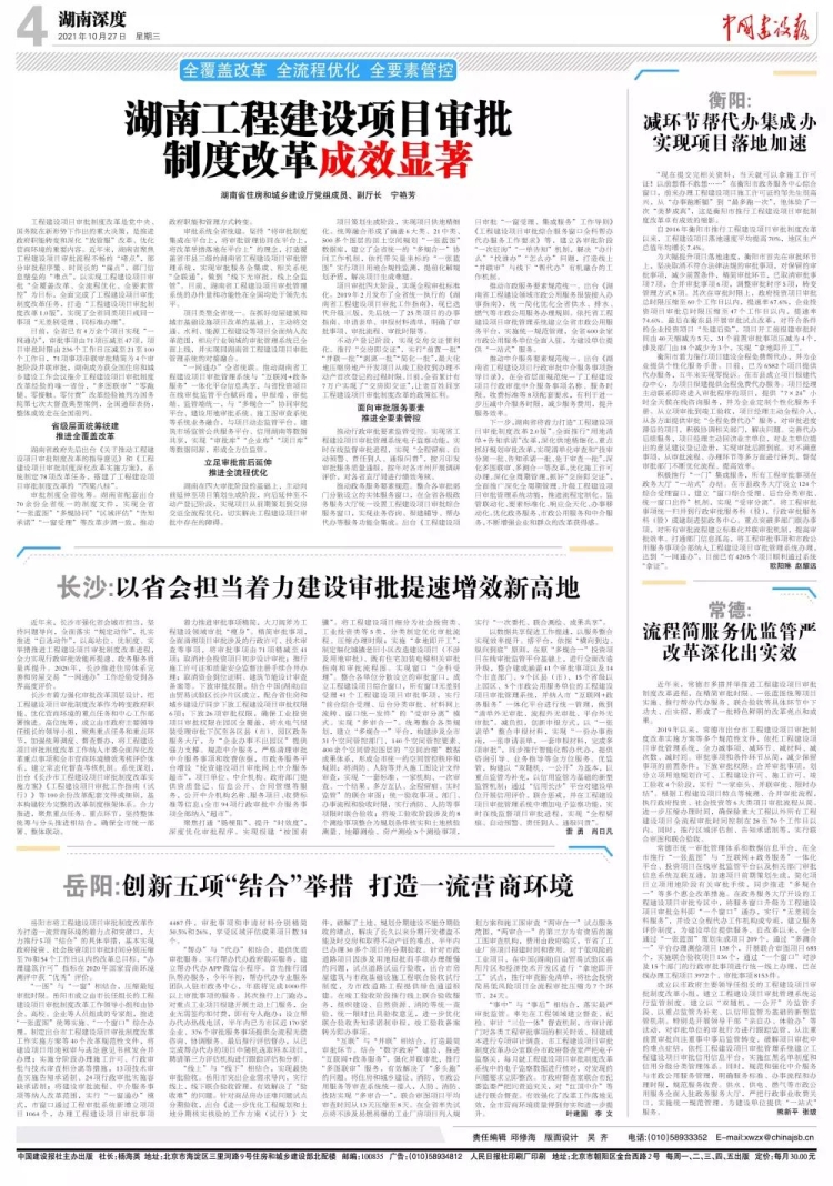 岳阳市将工程建设项目审批制度改革作为打造一流营商环境的着力点和突破口,大力推行5项“结合”的具体举措,基本实现政府投资、社会投资项目审批时间分别压缩至70和54个工作日以内的改革总目标,“办理建筑许可”指标在2020年国家营商环境测评中获“优秀”评价。