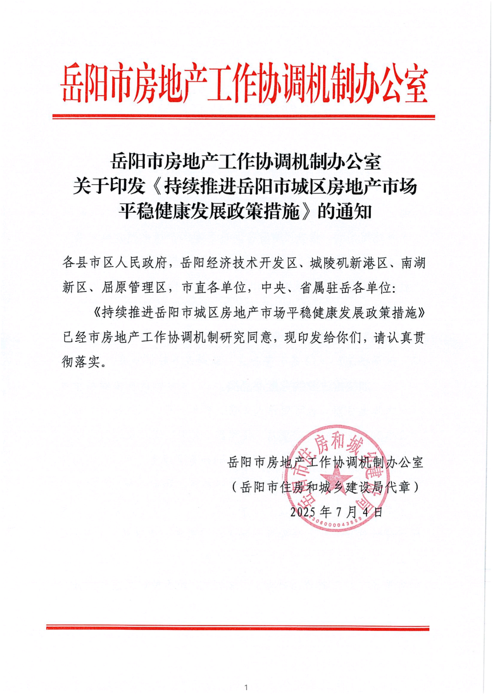 岳阳市房地产工作协调机制办公室关于印发《持续推进岳阳市城区房地产市场平稳健康发展政策措施》的通知