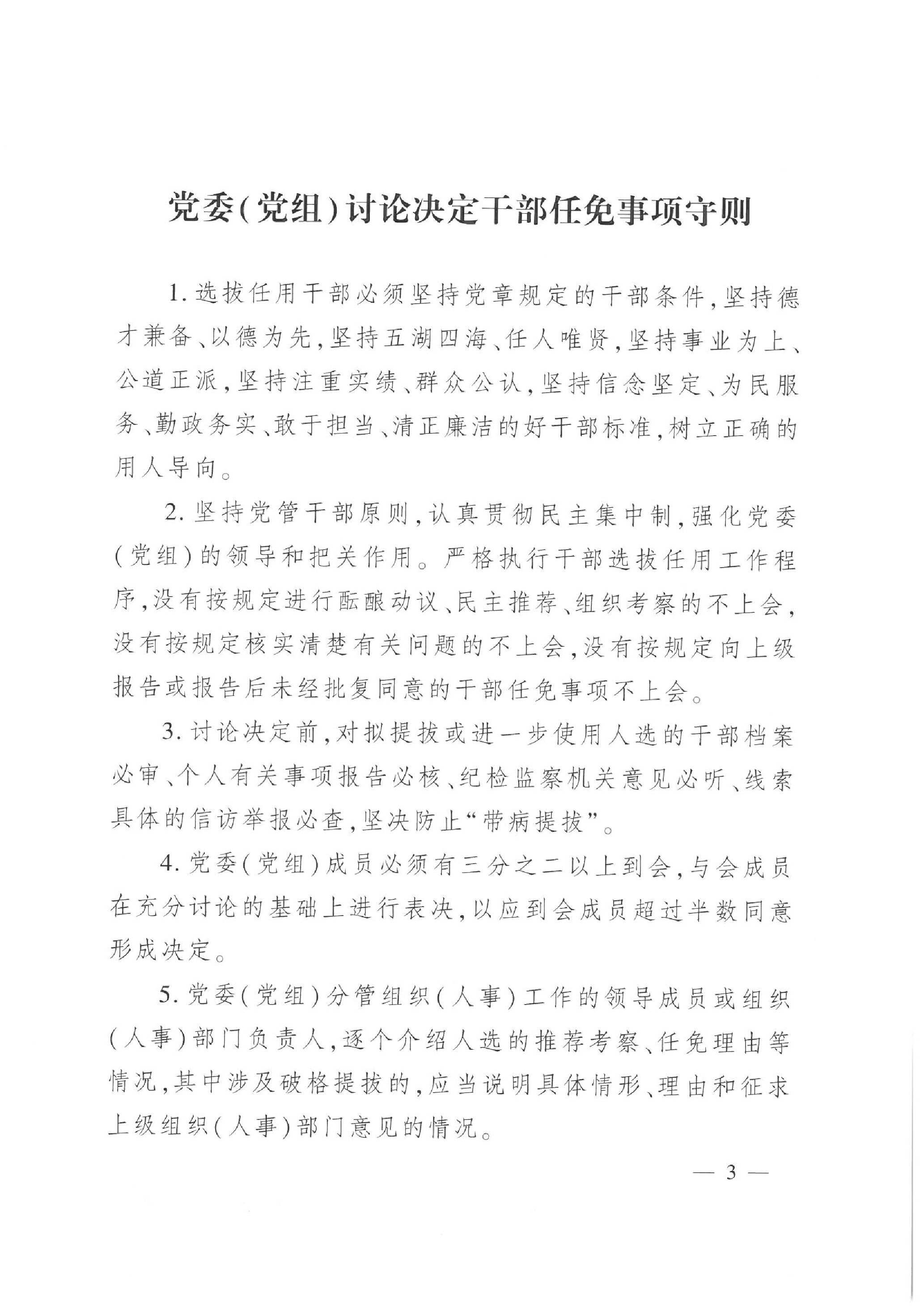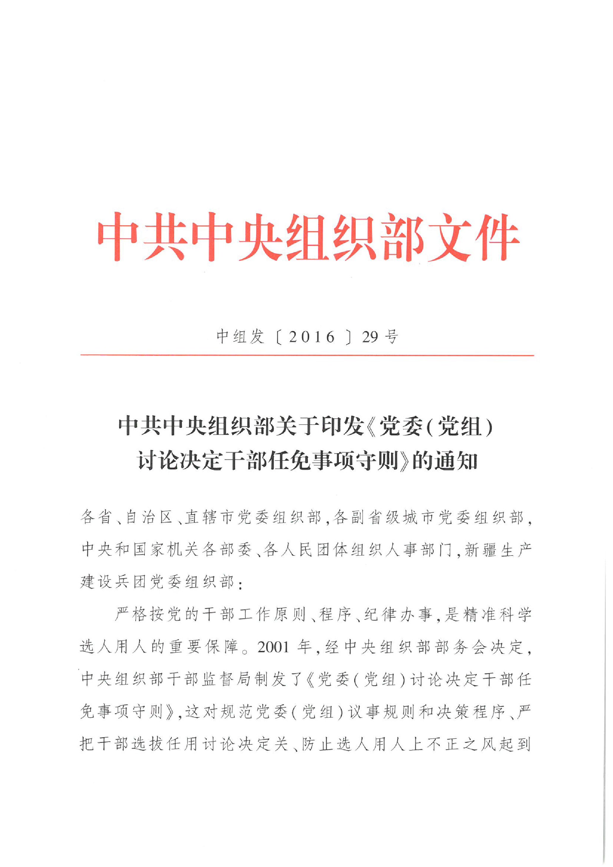 中共中央组织部关于印发《党委(党组)讨论决定干部任免事项守则》的通知(中组发〔2016〕29号