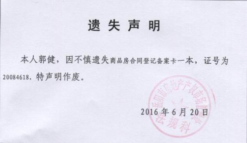 关于郭健的商品房备案卡遗失声明