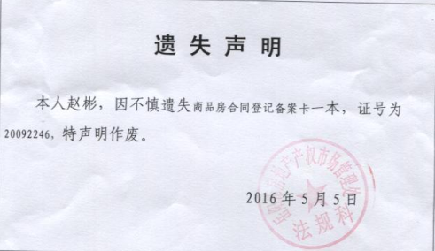 关于赵彬的商品房备案卡遗失声明