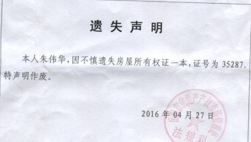 关于朱伟华的遗失声明公示
