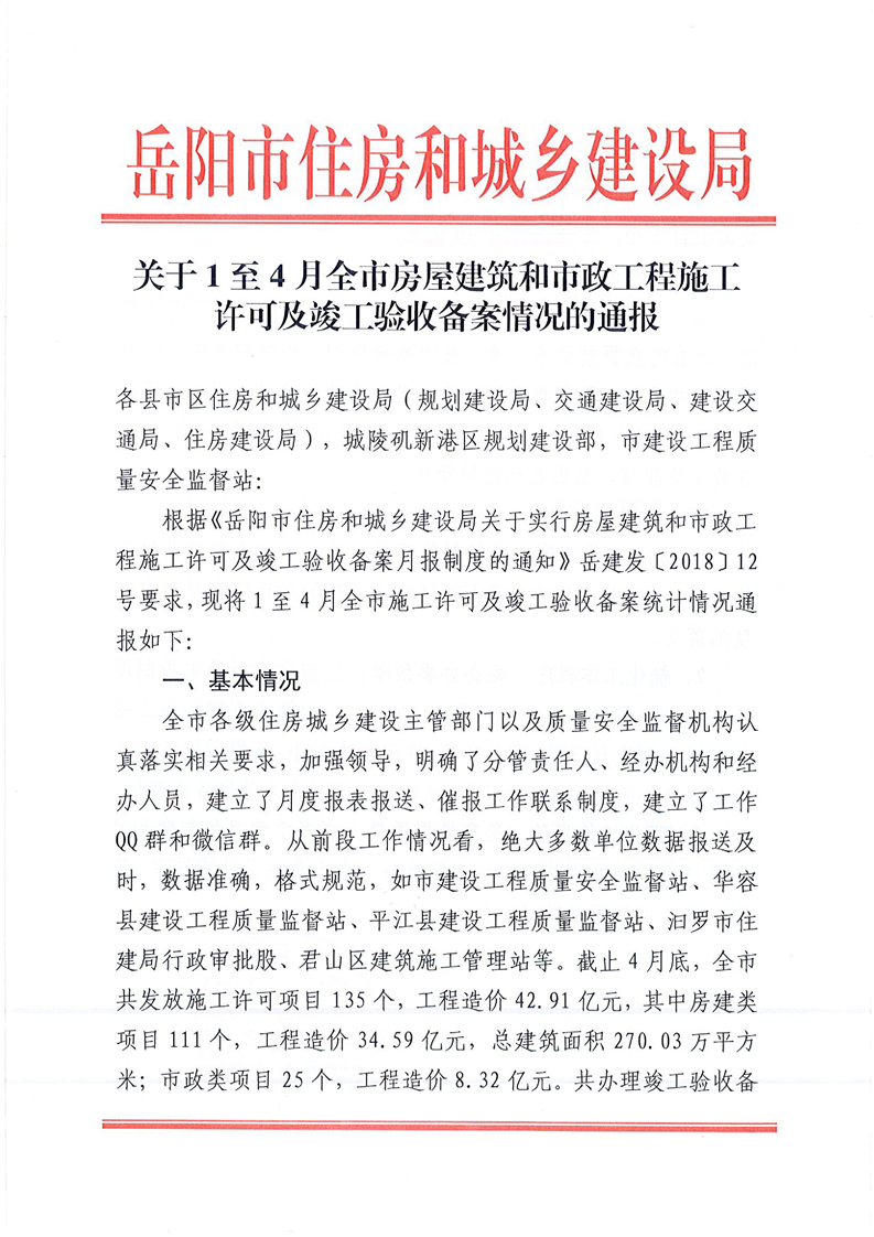 关于1至4月全市房屋建筑和市政工程施工许可及竣工验收备案情况的通报