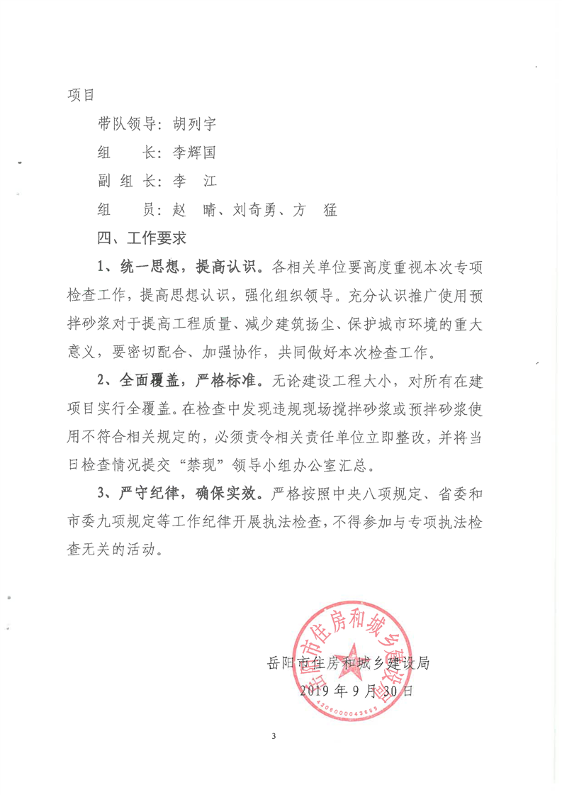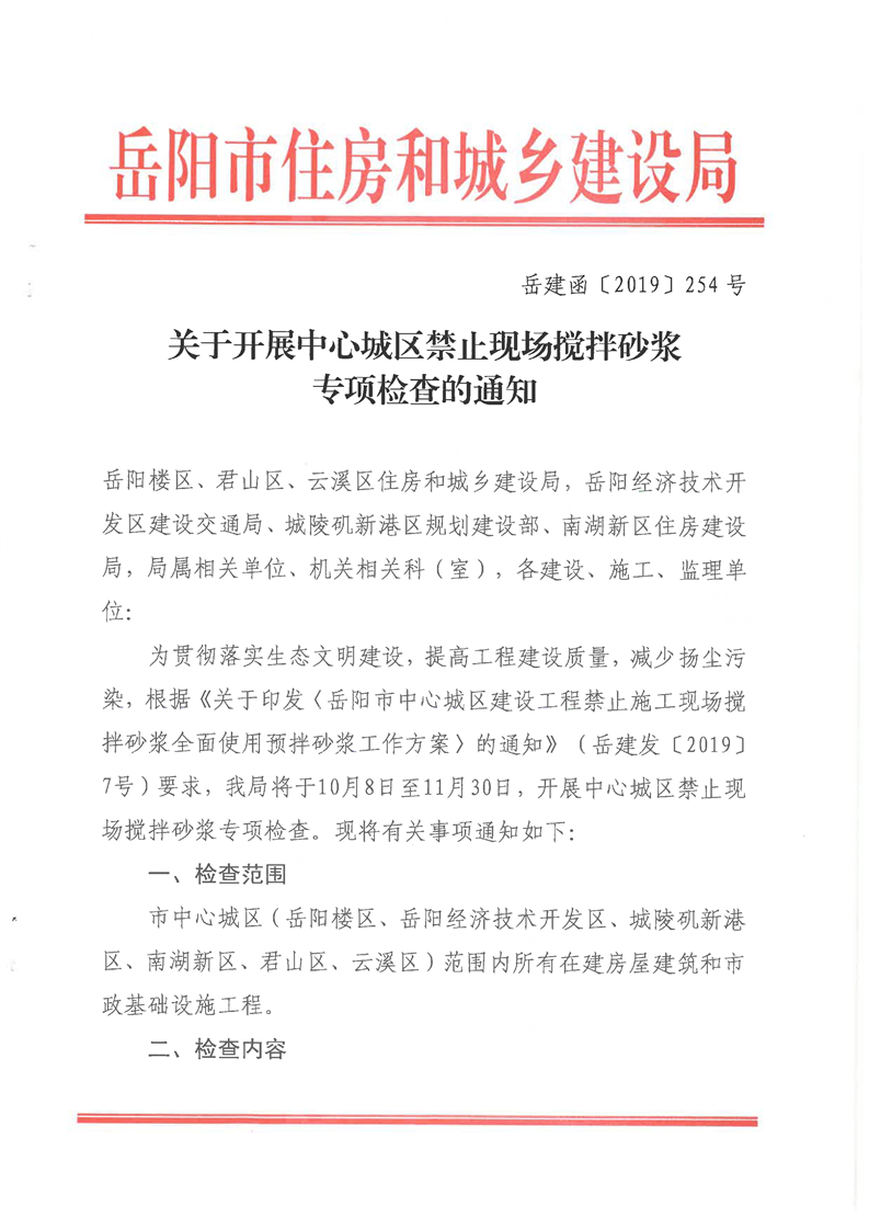 关于开展中心城区禁止现场搅拌砂浆专项检查的通知(岳建函[2019]254号)