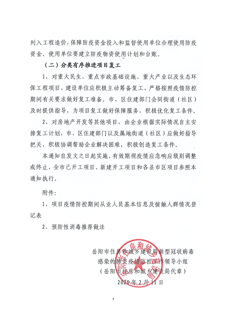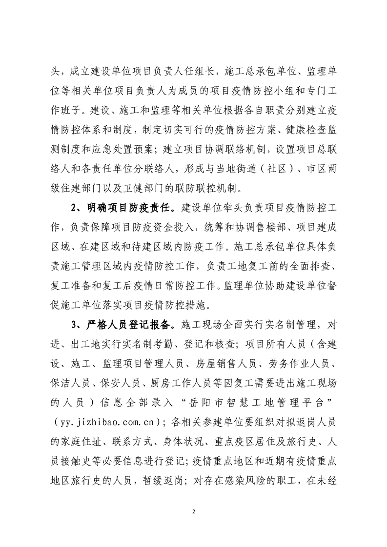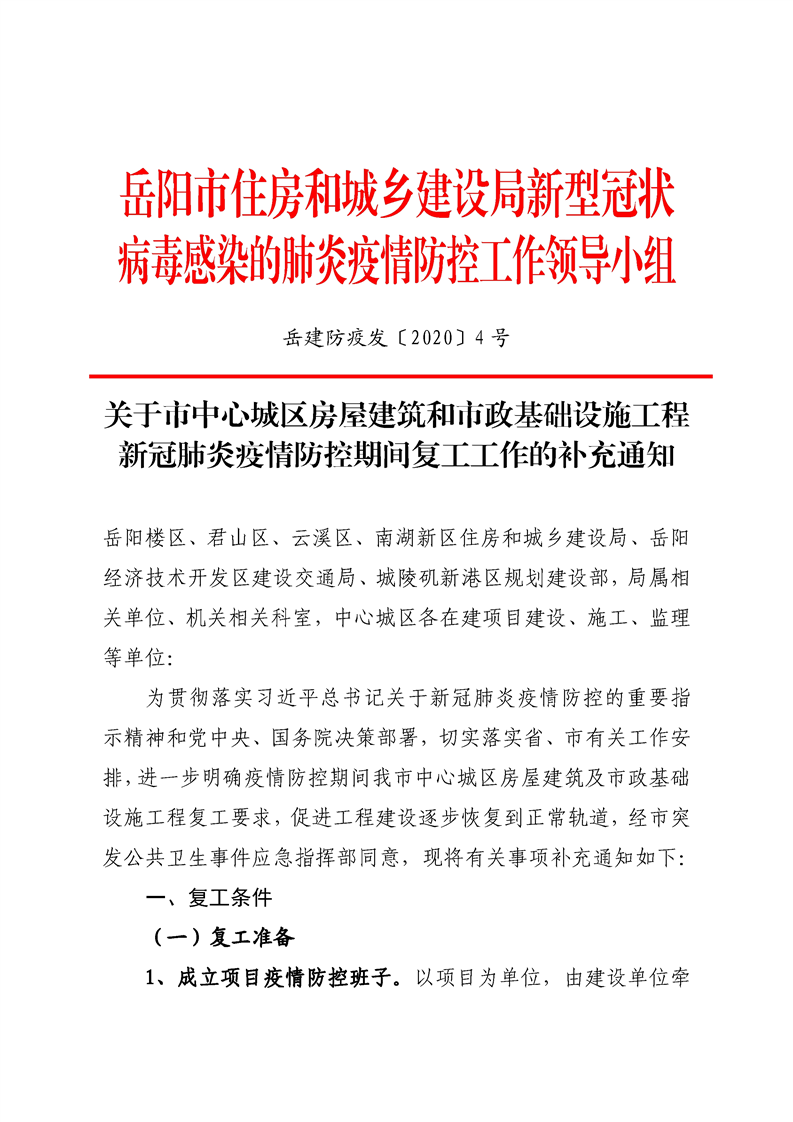 关于岳阳市中心城区房屋建筑和市政基础设施工程新冠肺炎疫情防控期间复工工作的补充通知