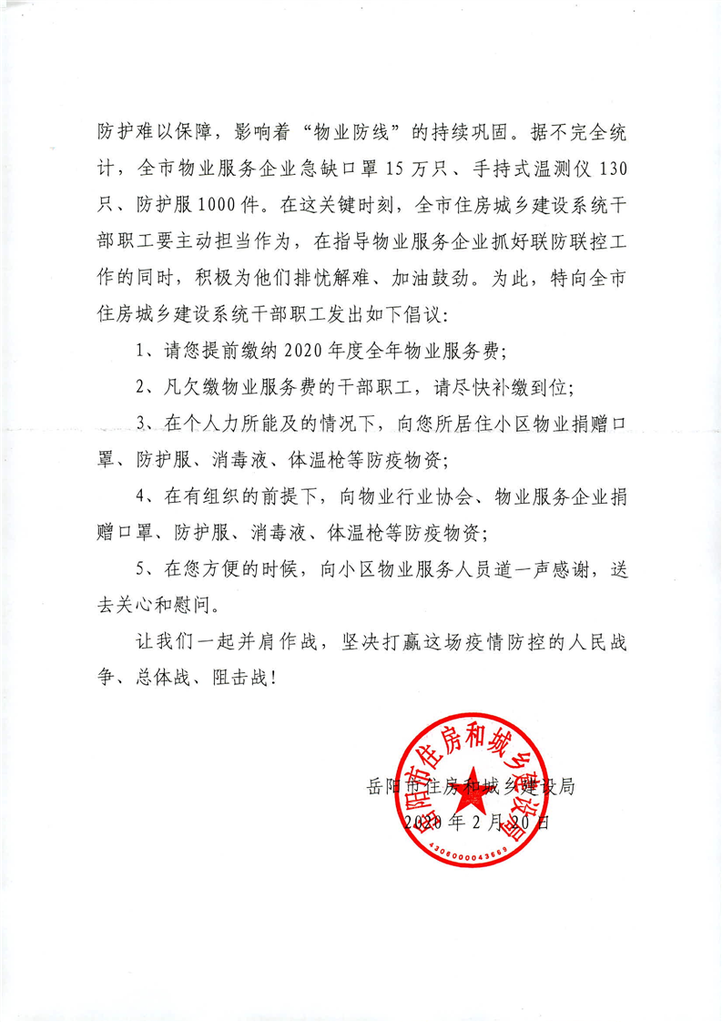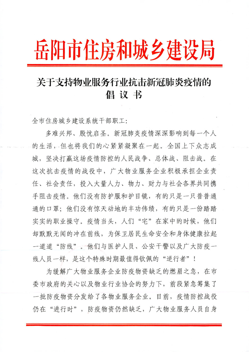 关于支持物业服务行业抗击新冠肺炎疫情的倡议书
