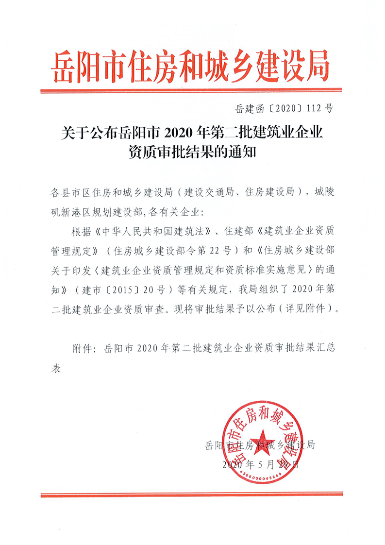 关于公布岳阳市2020年第二批建筑业企业资质审批结果的通知
