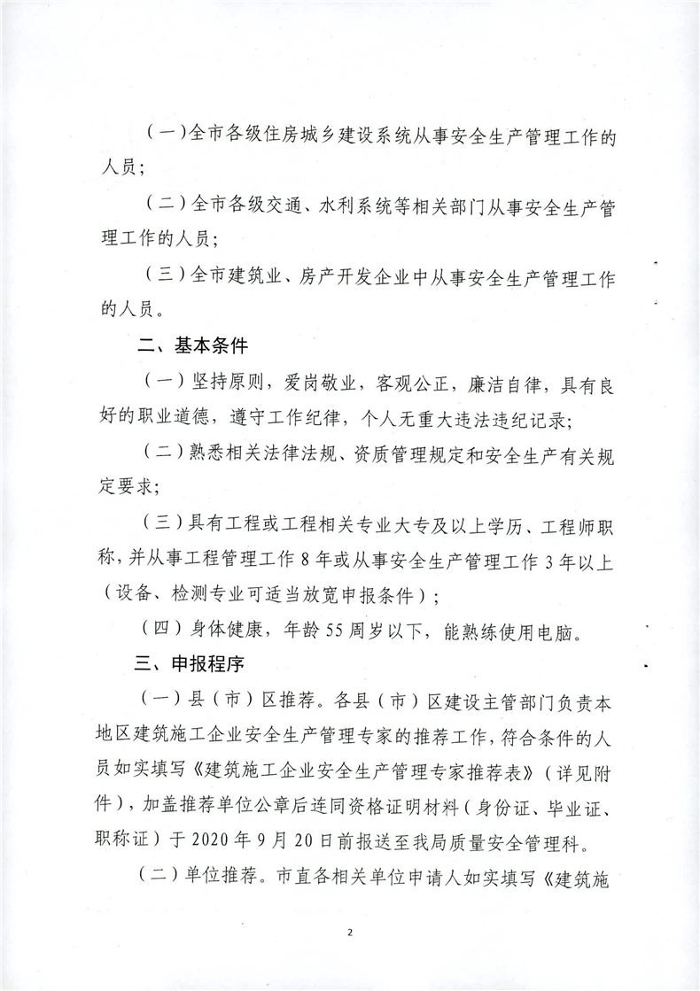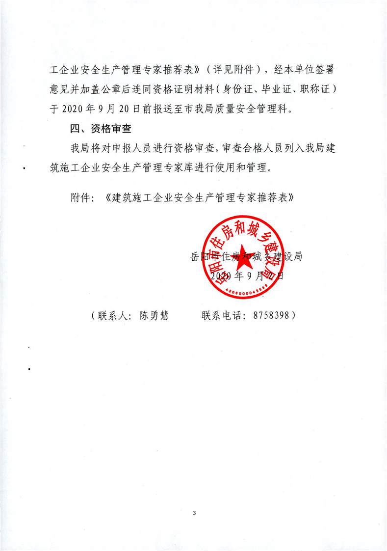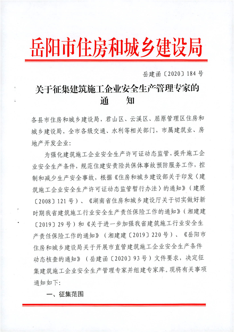 关于征集建筑施工企业安全生产管理专家的通知(岳建函[2020]184号)