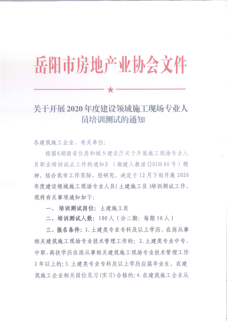 关于开展2020年度建设领域施工现场专业人员培训测试的通知