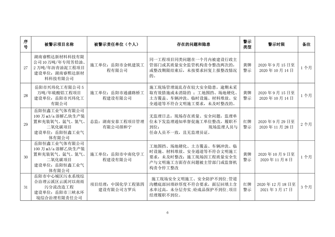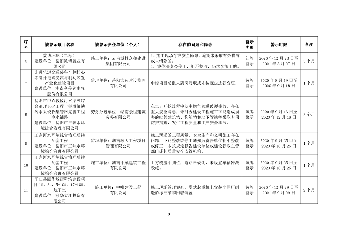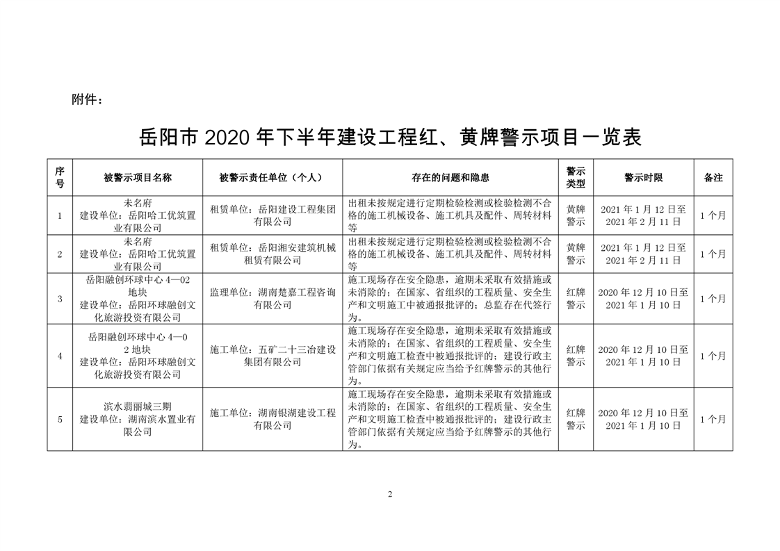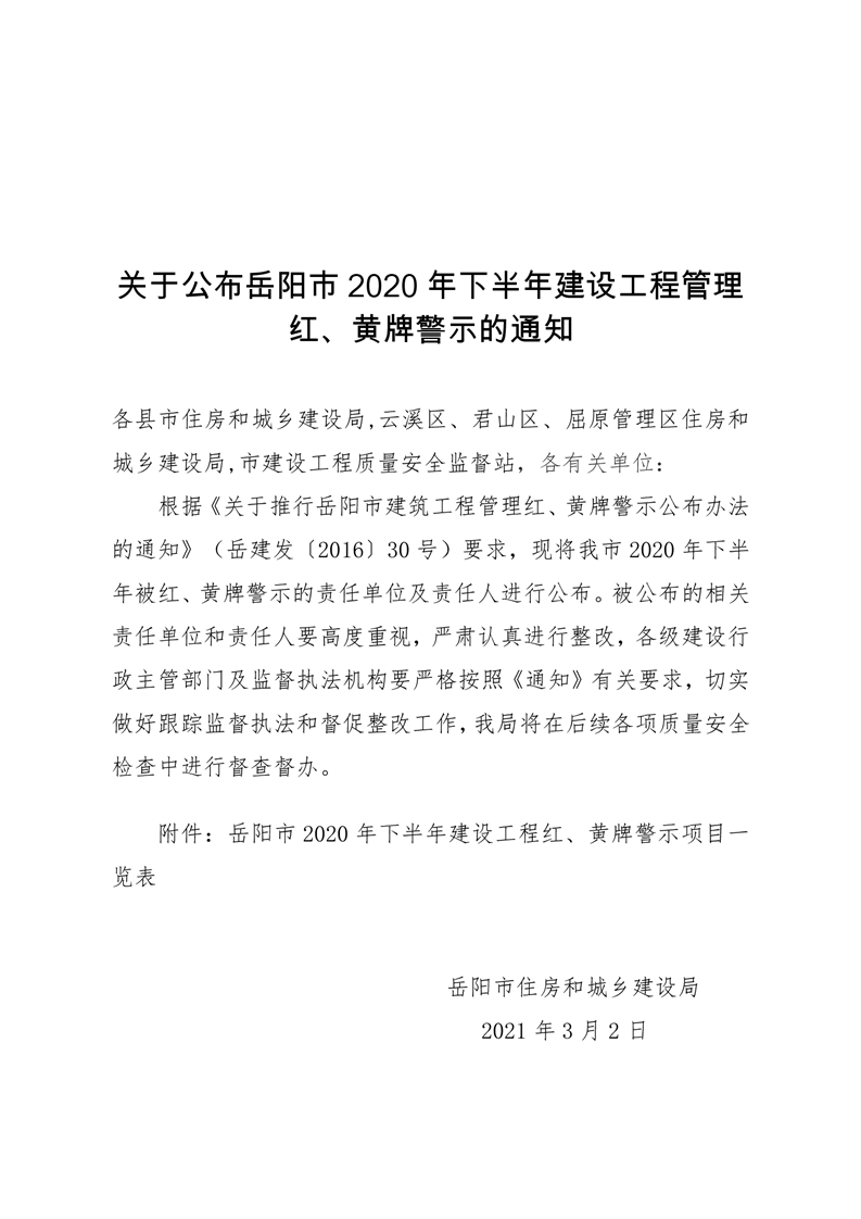 关于公布岳阳市2020年下半年建设工程管理红、黄牌警示的通知