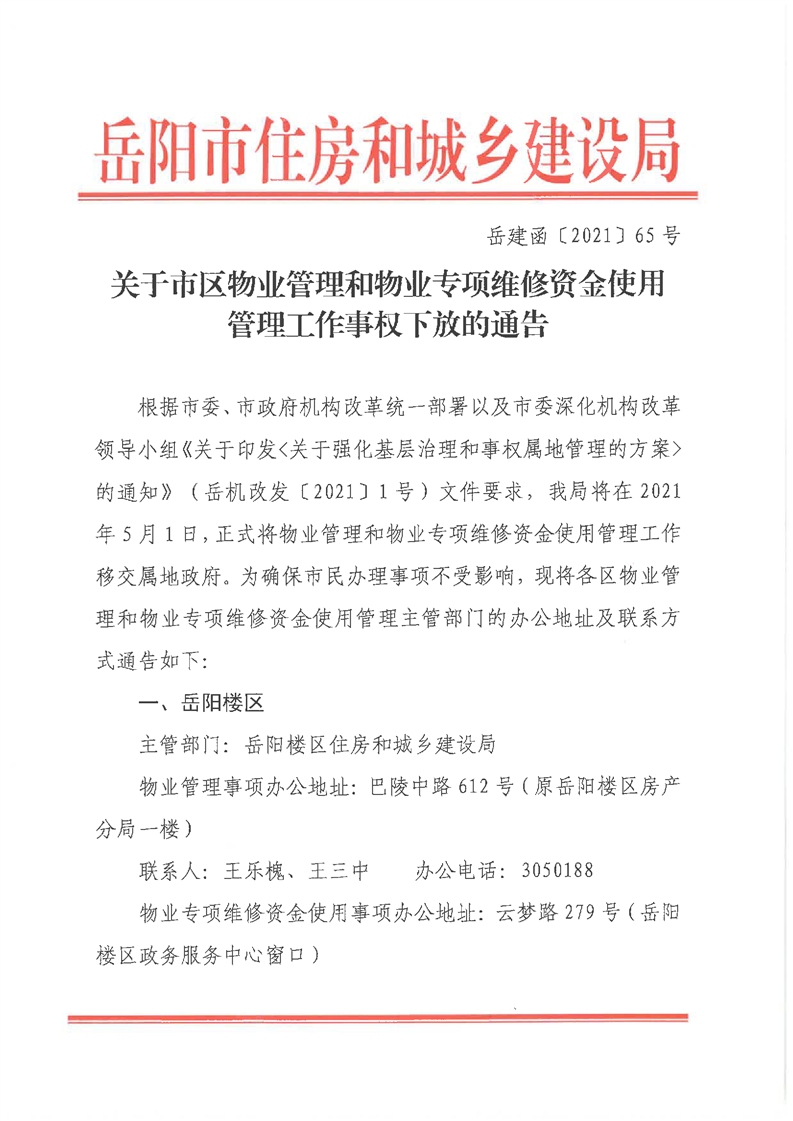 关于市区物业管理和物业专项维修资金使用管理工作事权下放的通告