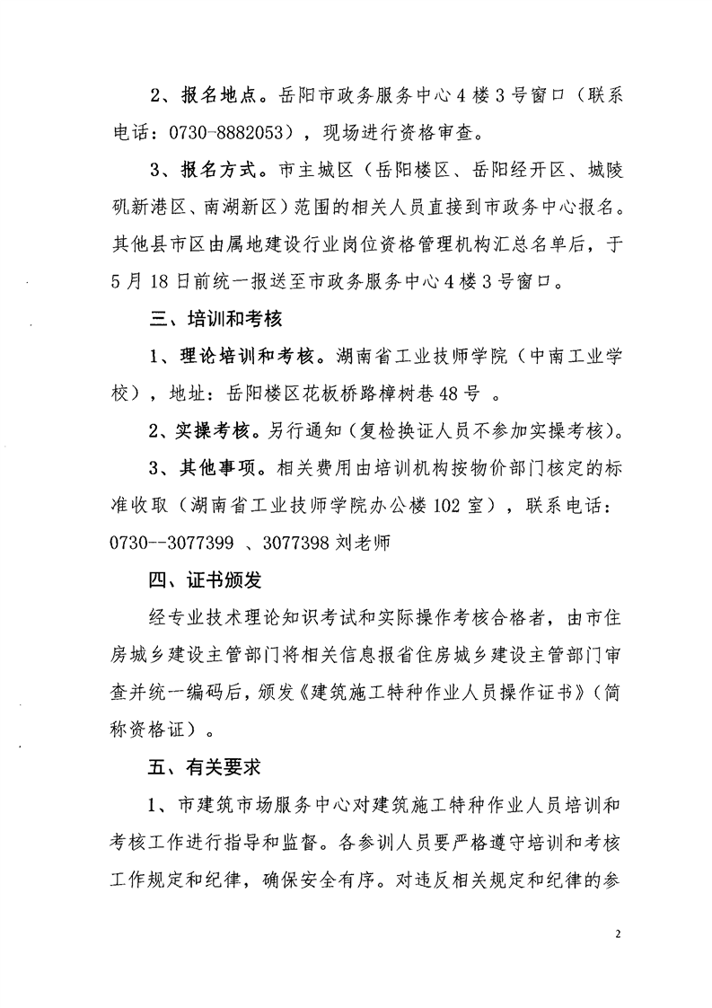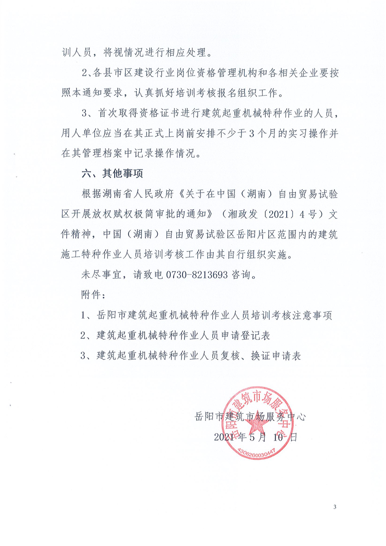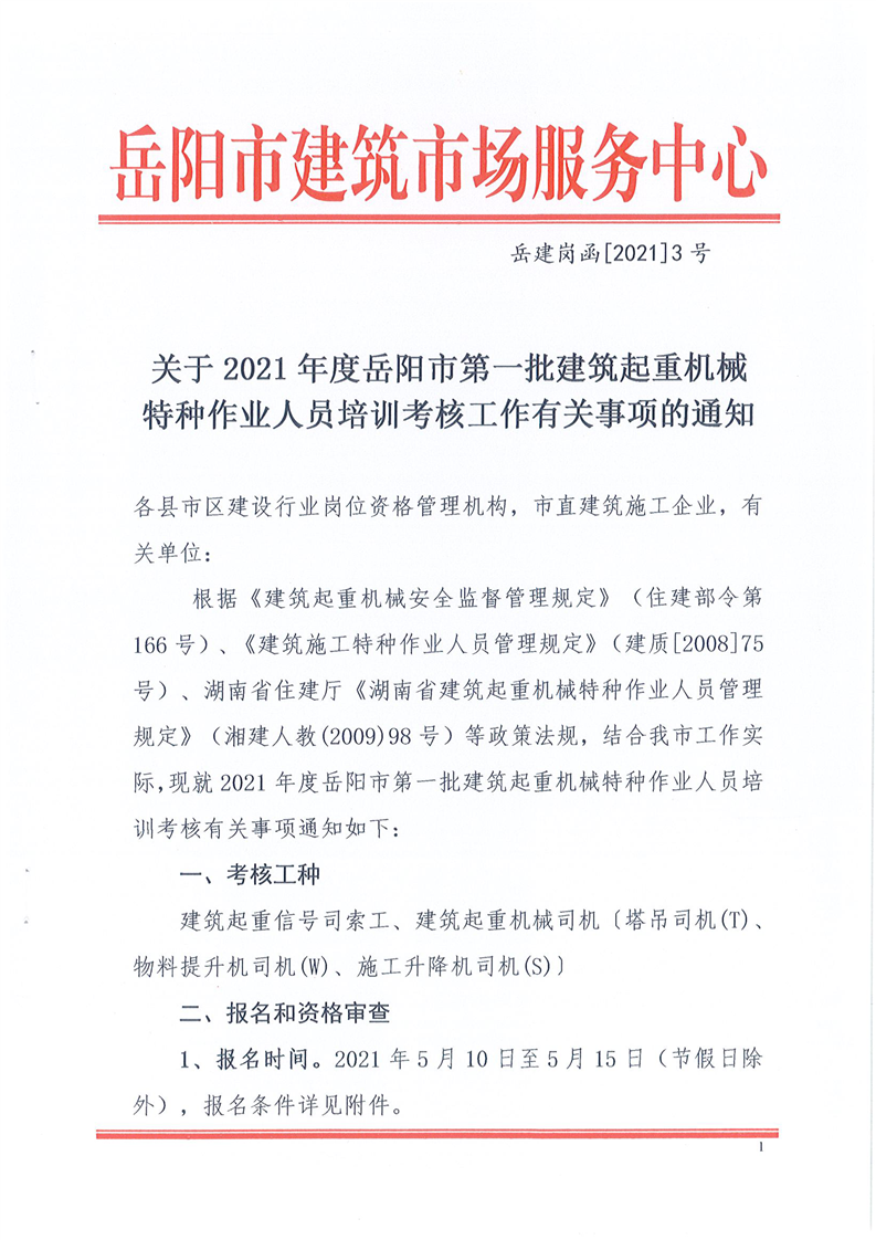关于2021年度岳阳市第一批建筑起重机械特种作业人员培训考核工作有关事项的通知