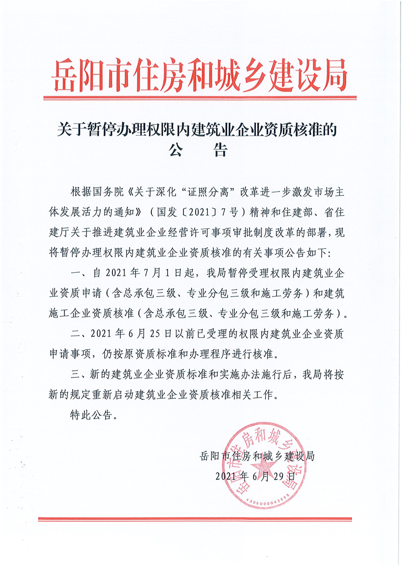 关于暂停办理权限内建筑业企业资质核准的公告