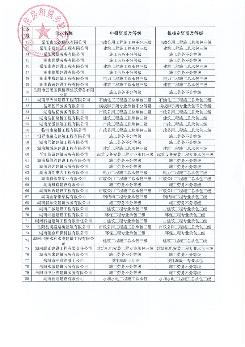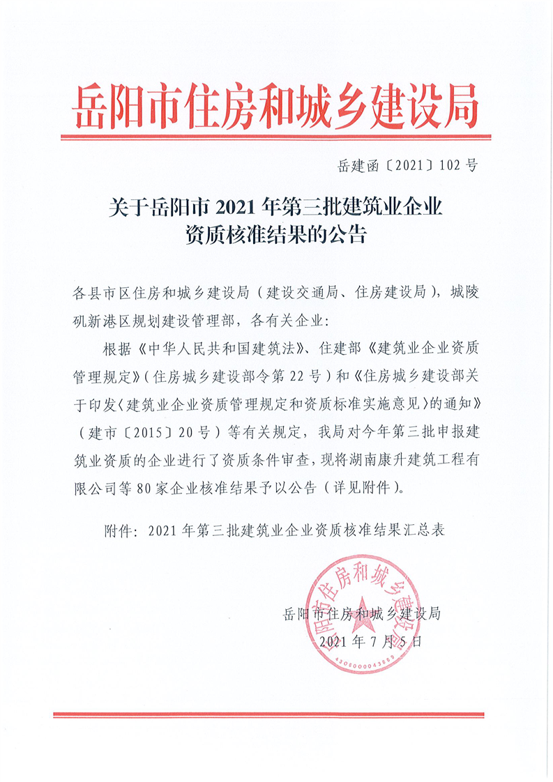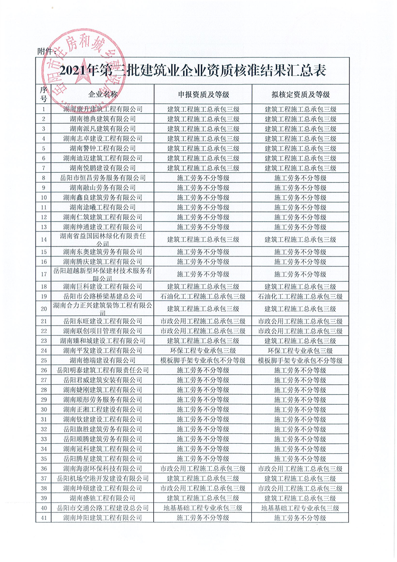 关于岳阳市2021年第三批建筑业企业资质核准结果的公告