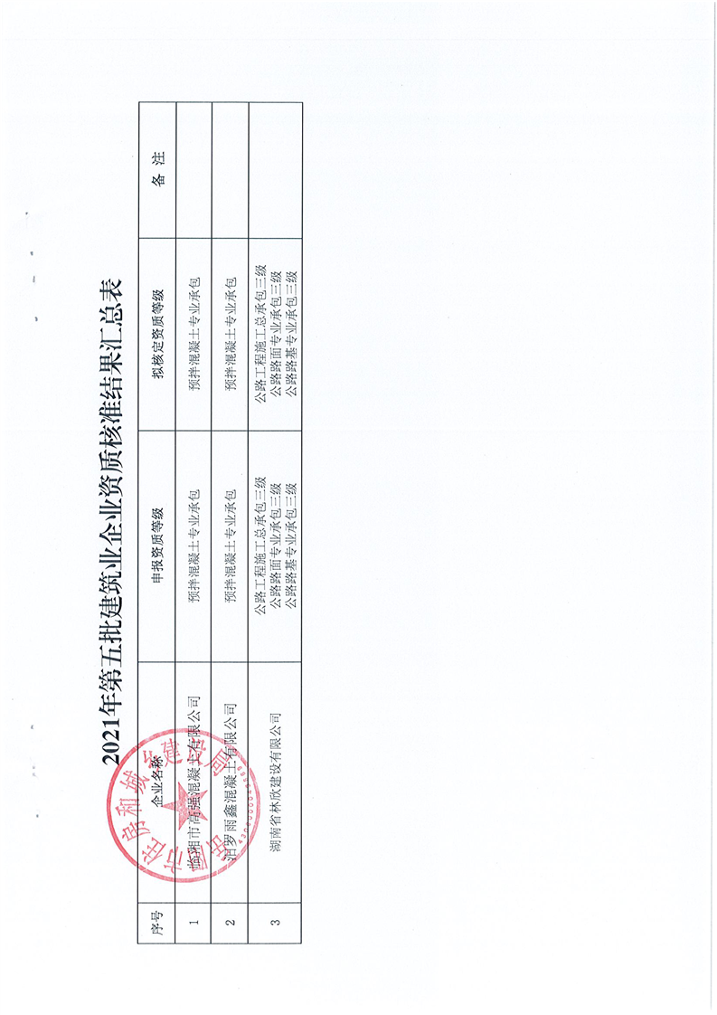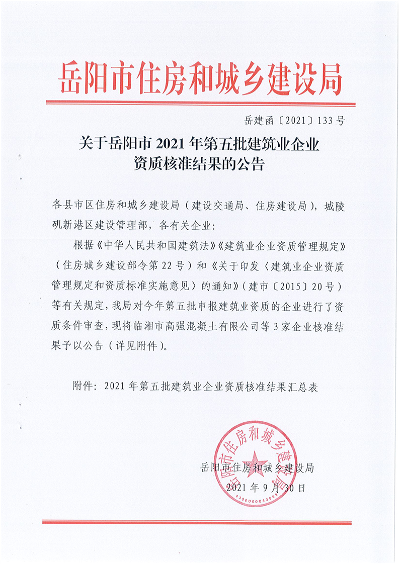 关于岳阳市2021年第五批建筑业企业资质核准结果的公告