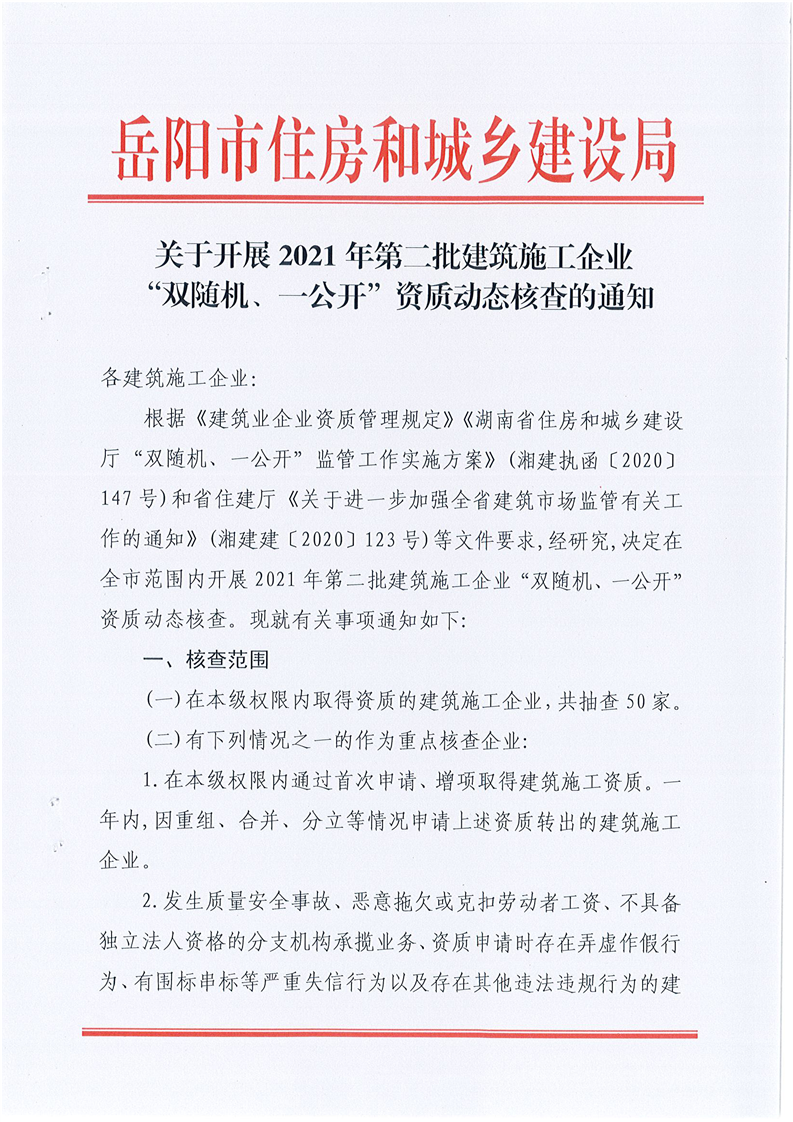 关于开展2021年第二批建筑施工企业“双随机、一公开”资质动态核查的通知
