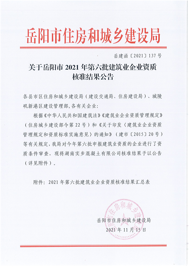 关于岳阳市2021年第六批建筑业企业资质核准结果公告