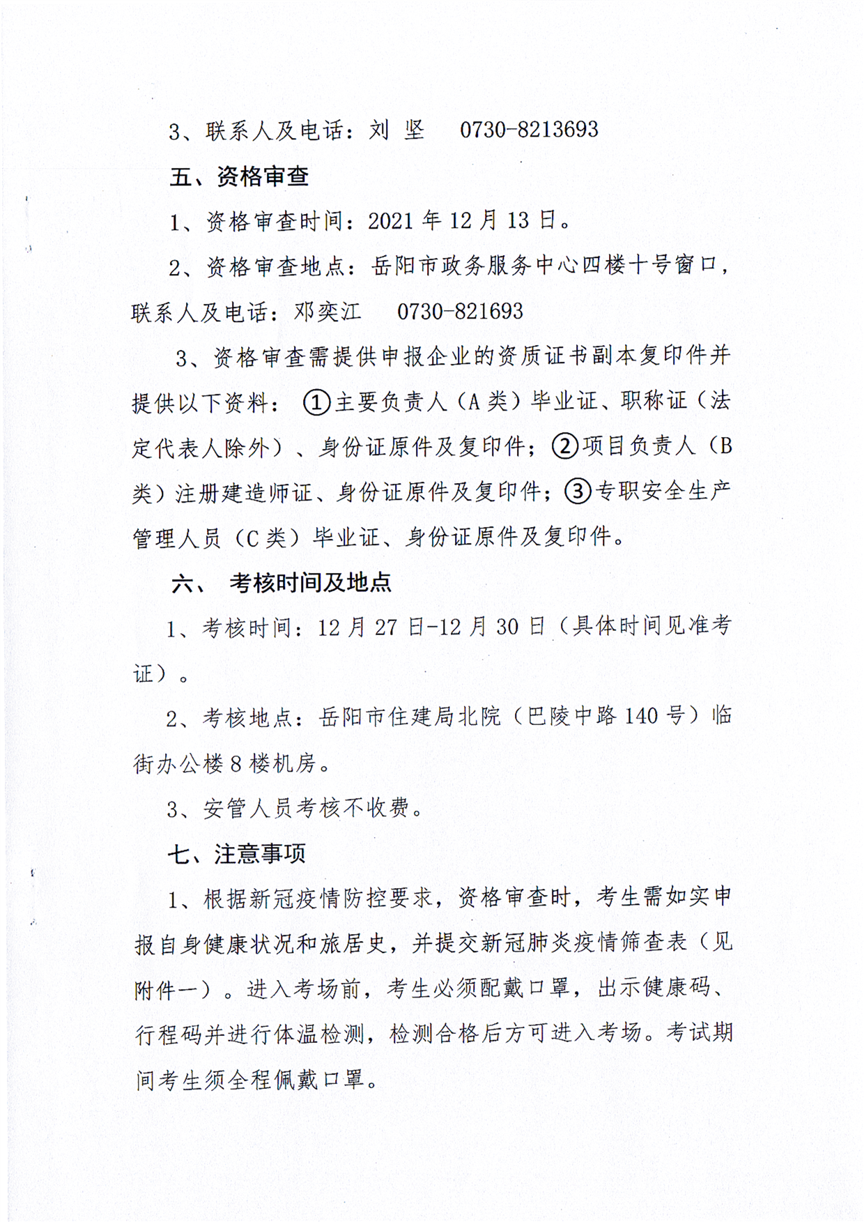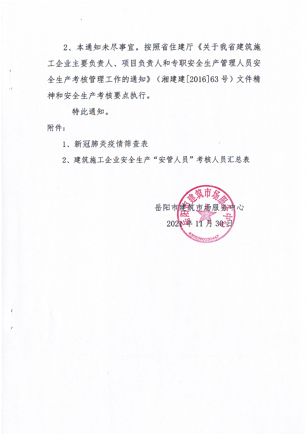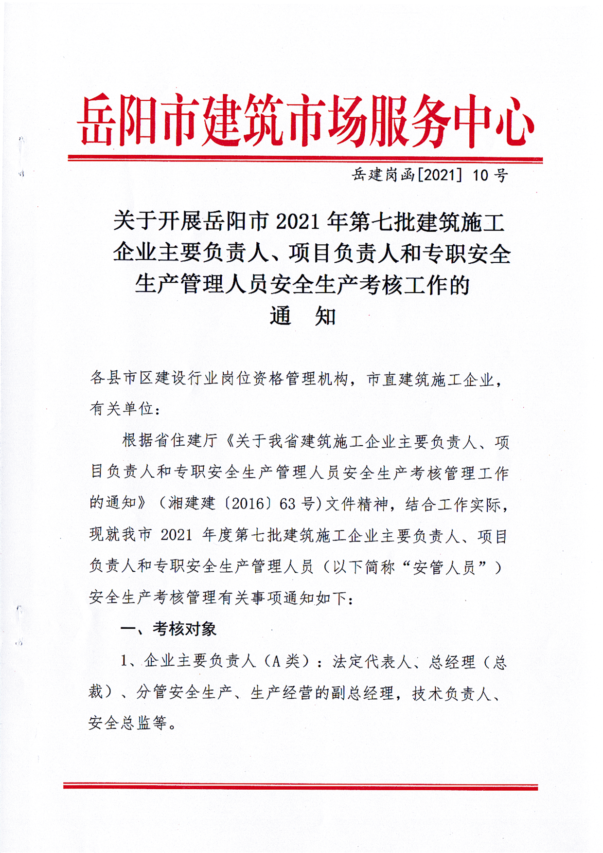 关于开展岳阳市2021年第七批建筑施工企业主要负责人、项目负责人和专职安全生产管理人员安全生产考核工作的通知