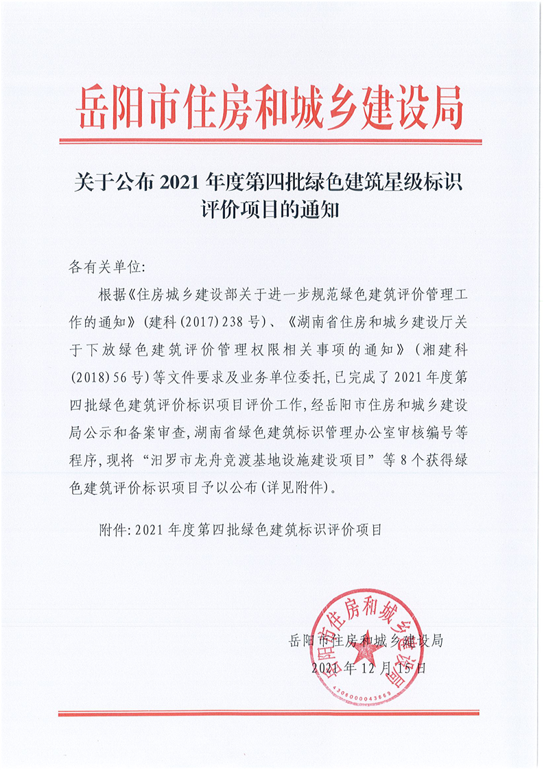 关于公布2021年度第四批绿色建筑星级标识评价项目的通知