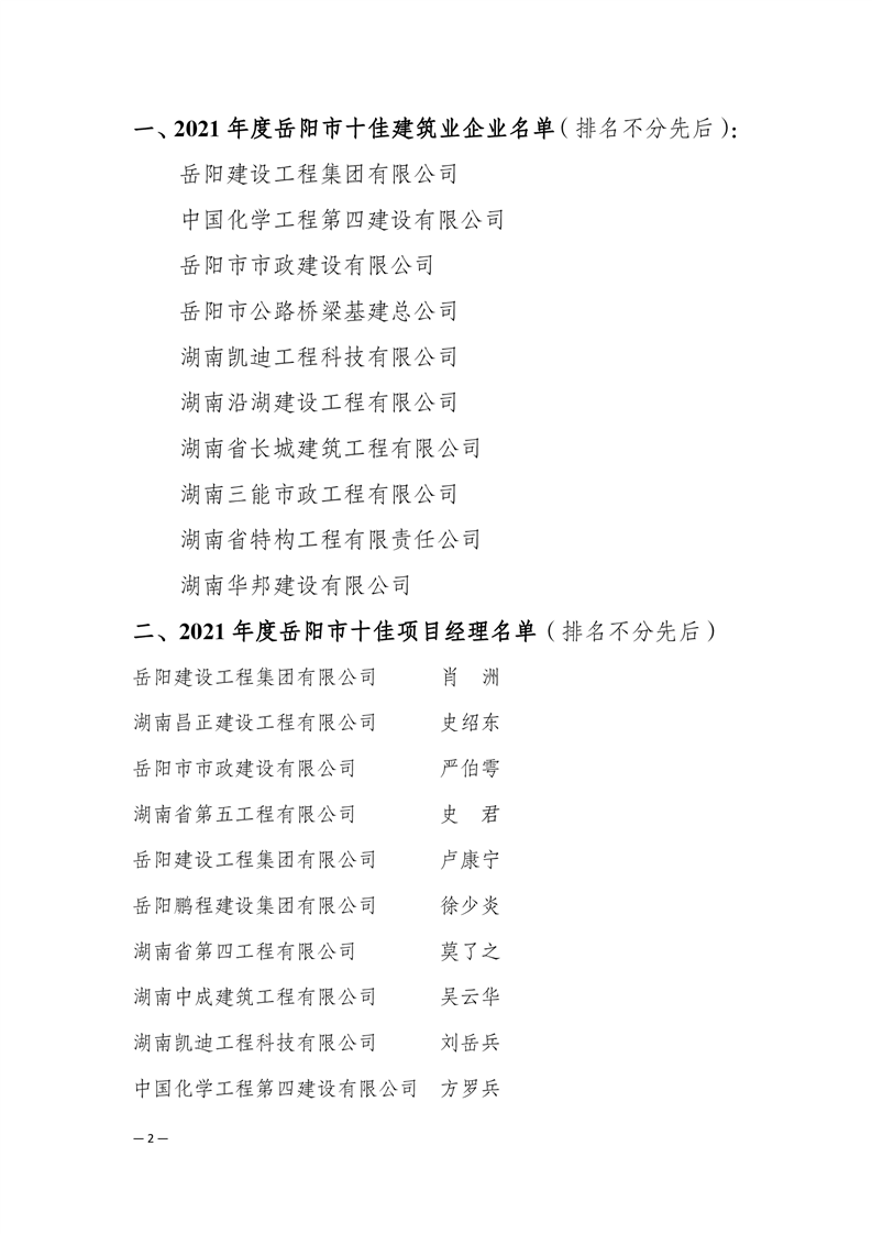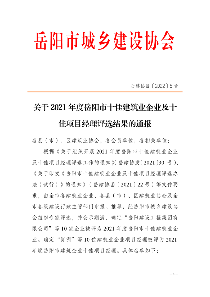 关于2021年度岳阳市十佳建筑业企业及十佳建筑业企业项目经理评选结果的通报