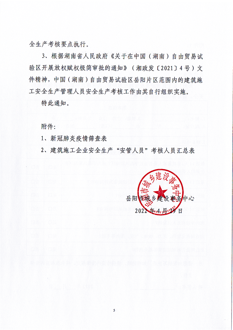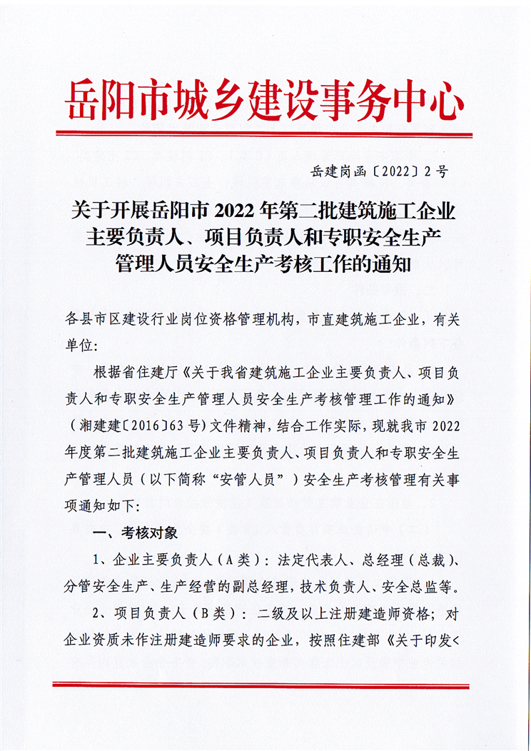 关于开展岳阳市2022年第二批建筑施工企业主要负责人、项目负责人和专职安全生产管理人员安全生产考核工作的通知