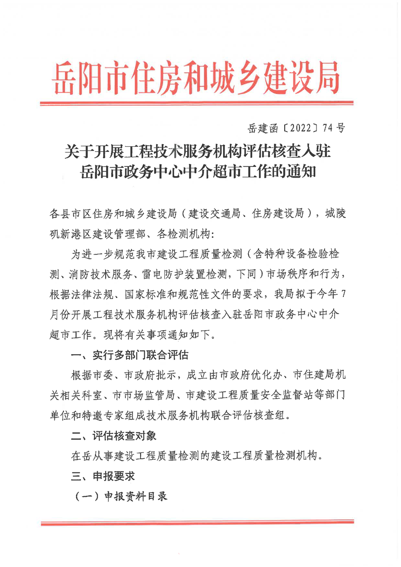 关于开展工程技术服务机构评估核查入驻岳阳市政务中心中介超市工作的通知