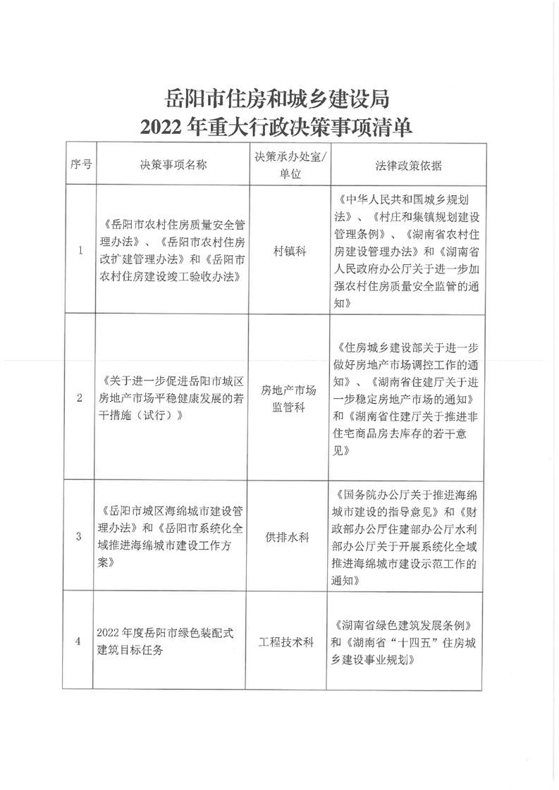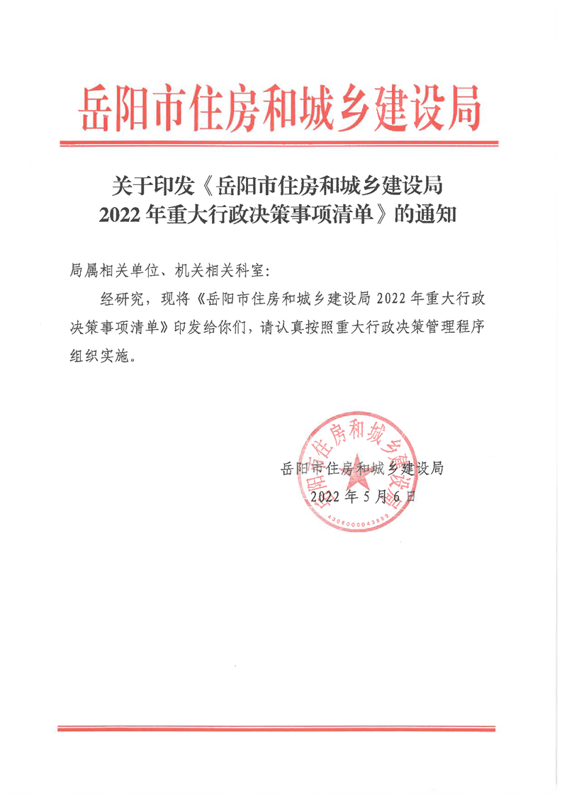 关于印发《岳阳市住房和城乡建设局2022年重大行政决策事项清单》的通知