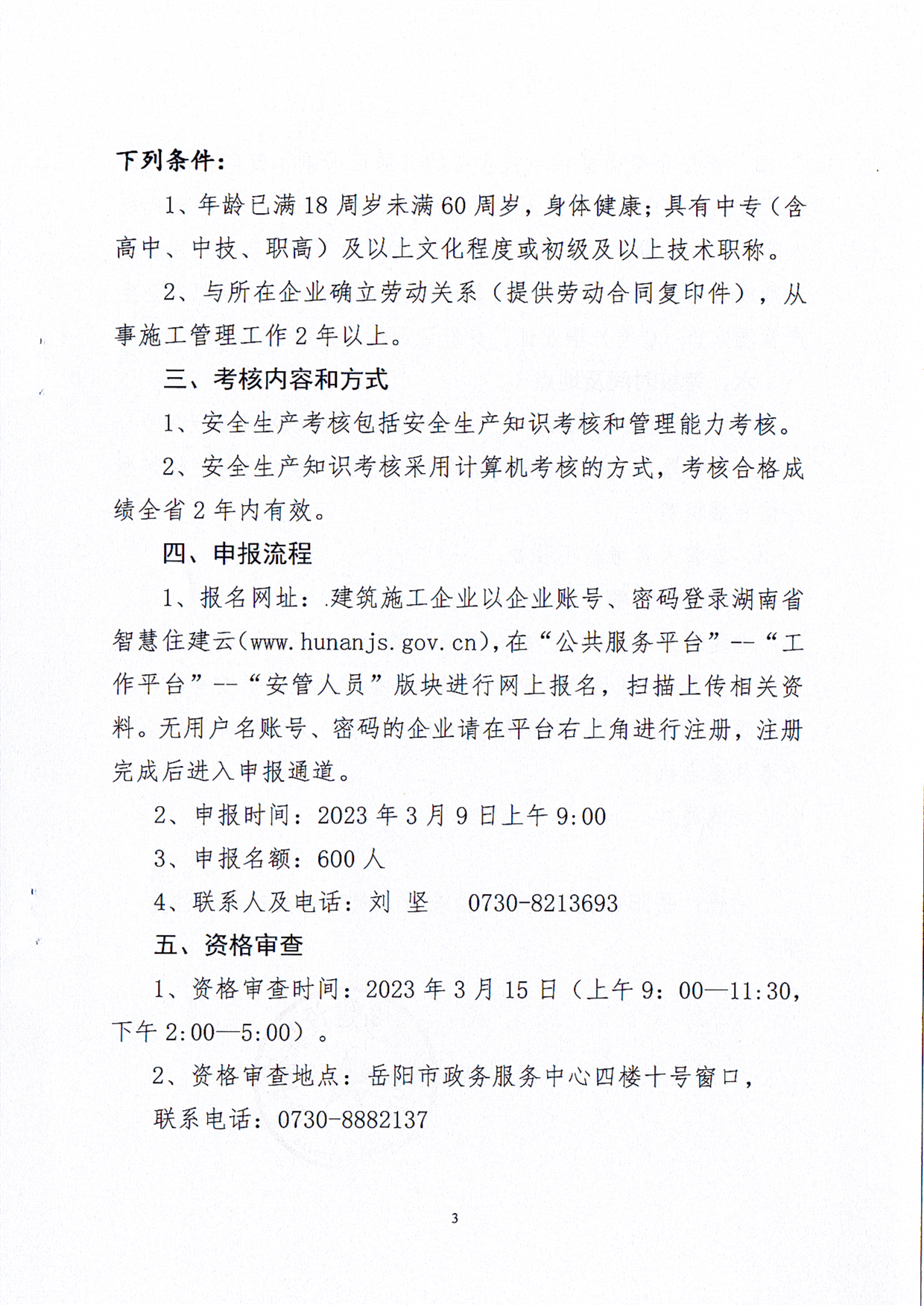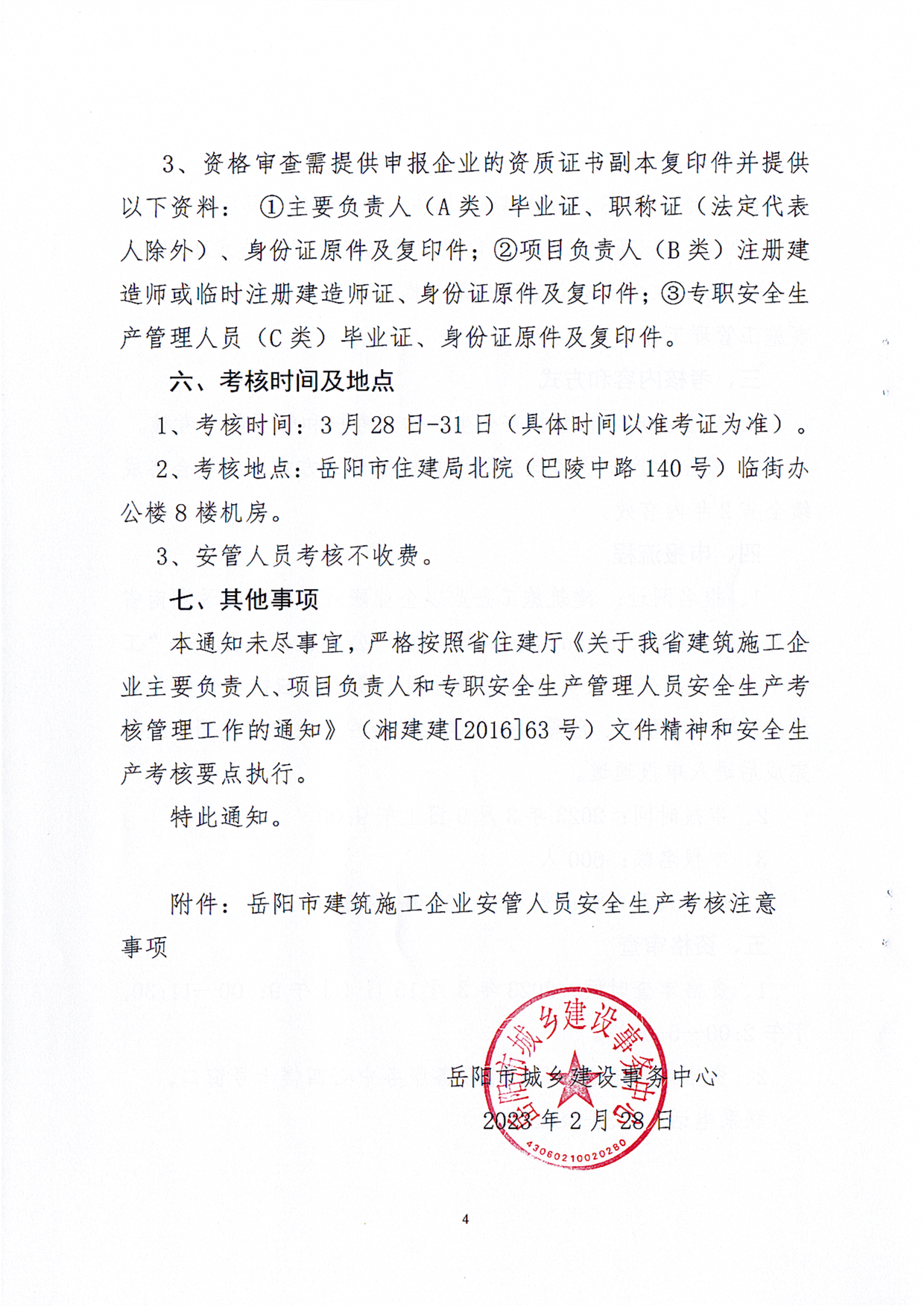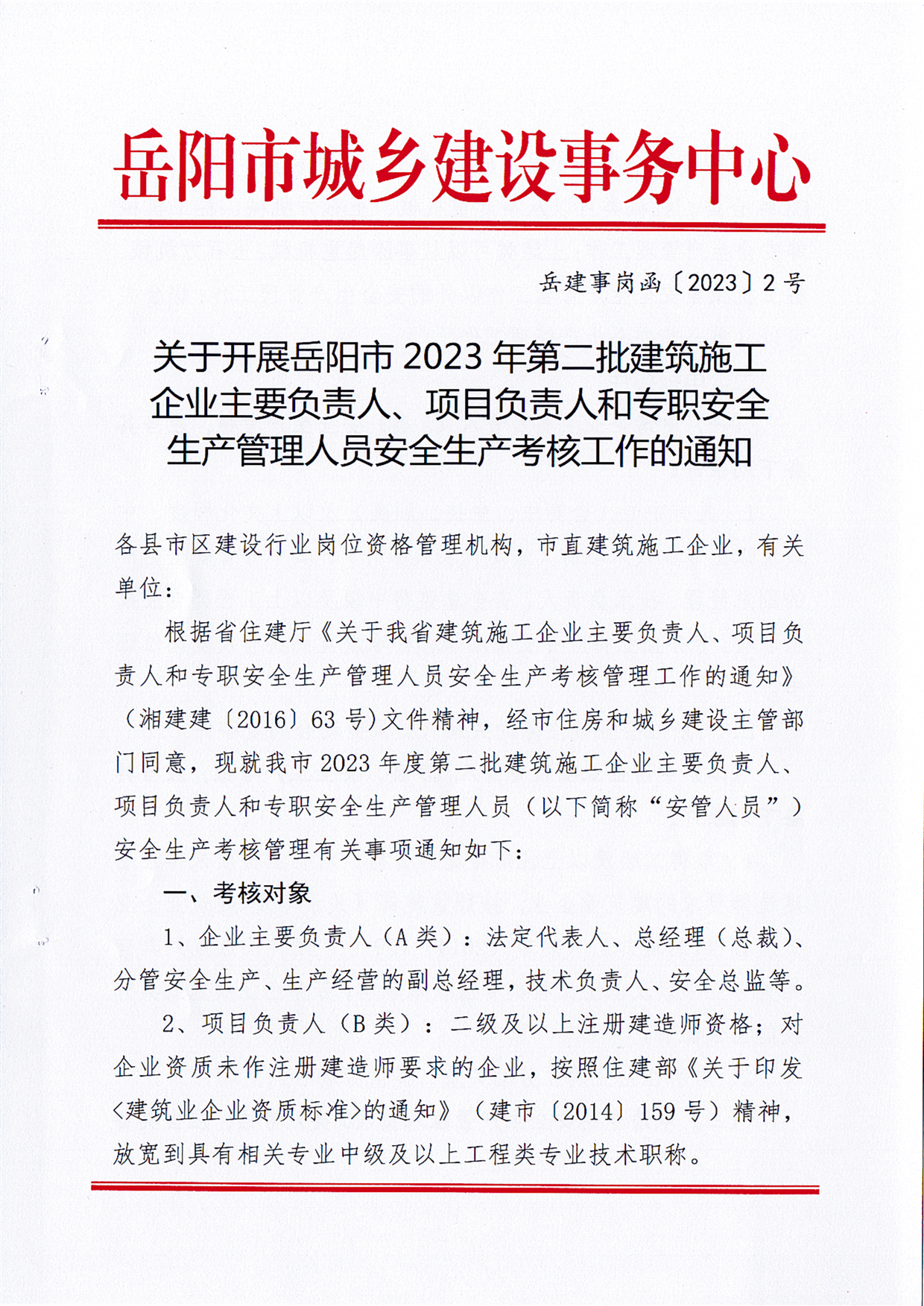 关于开展岳阳市2023年第二批建筑施工企业主要负责人、项目负责人和专职安全生产管理人员安全生产考核工作的通知