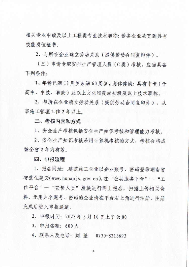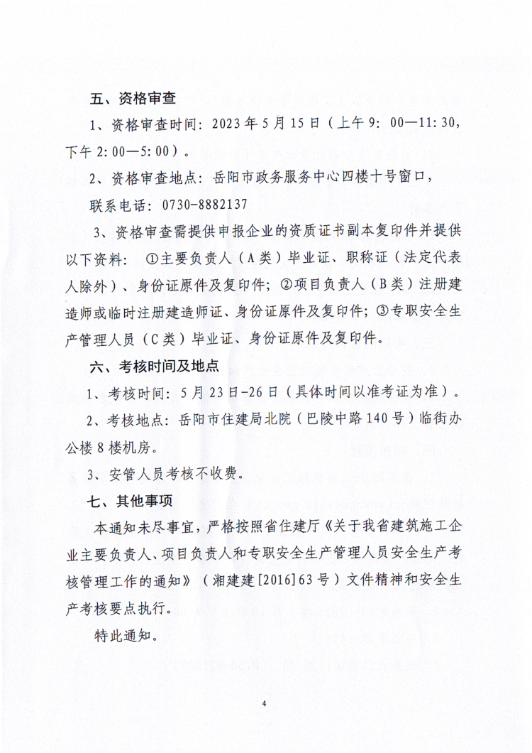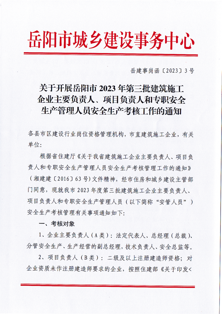 关于开展岳阳市2023年第三批建筑施工企业主要负责人、项目负责人和专职安全生产管理人员安全生产考核工作的通知