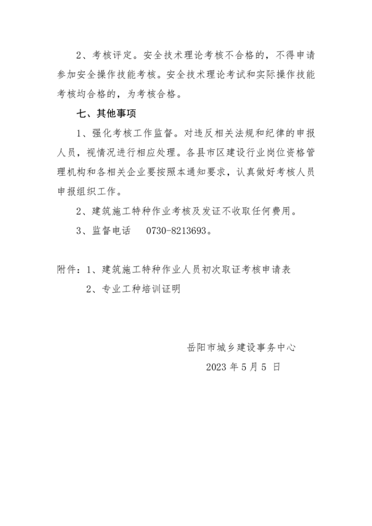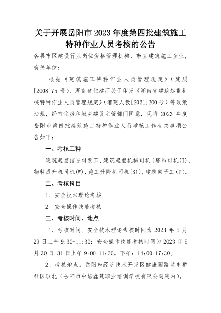 关于开展岳阳市2023 年度第四批建筑施工特种作业人员考核的公告