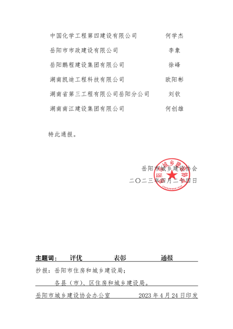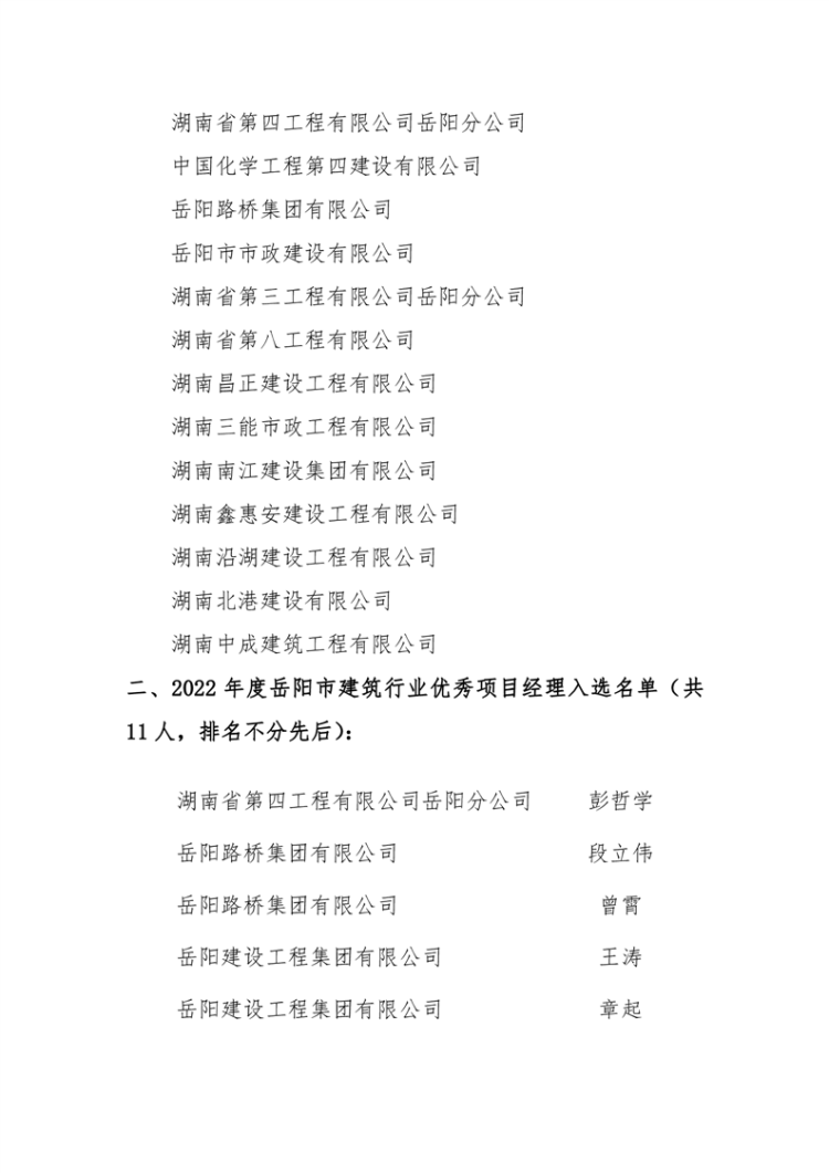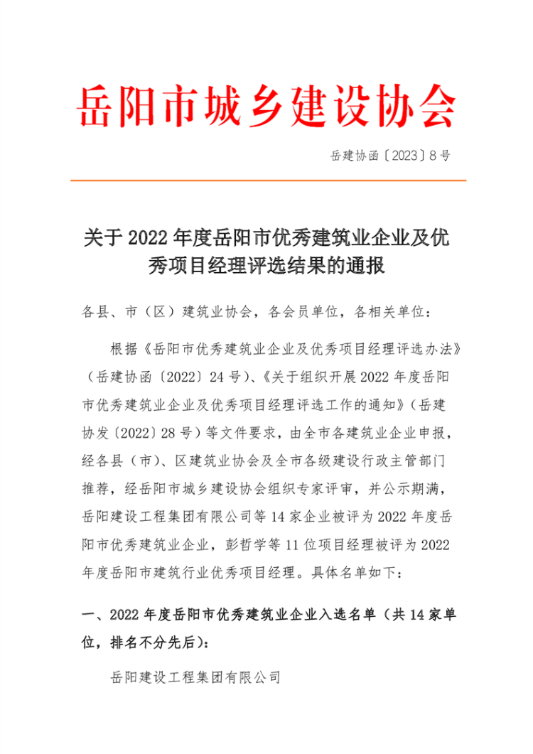 关于2022年度岳阳市优秀建筑业企业及优秀项目经理评选结果的通报