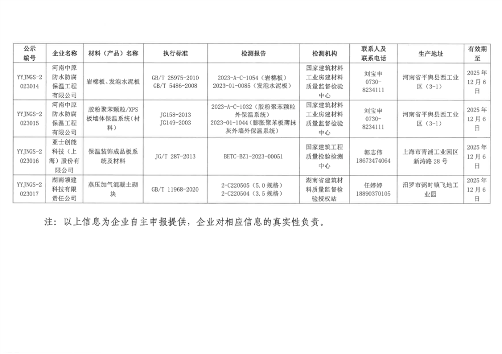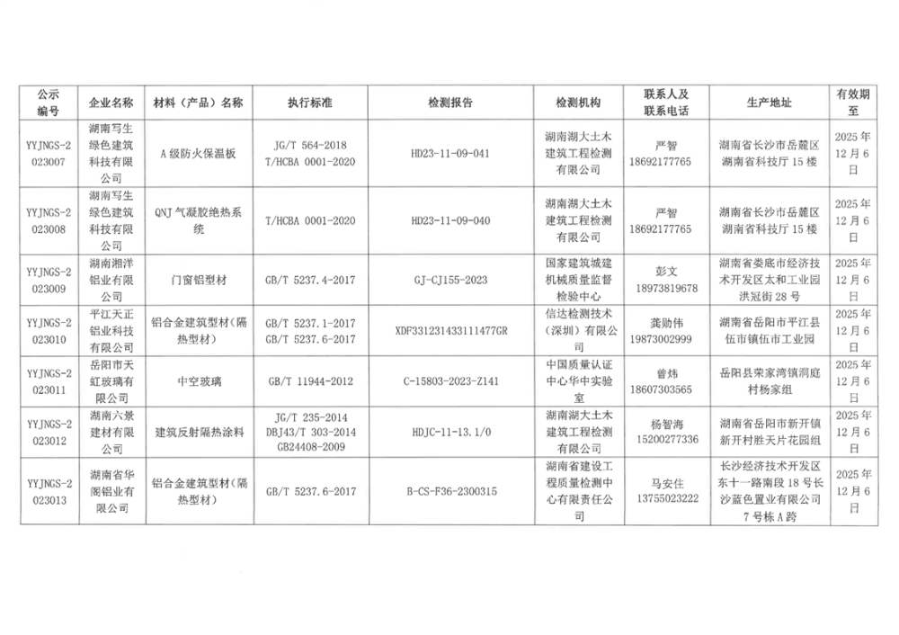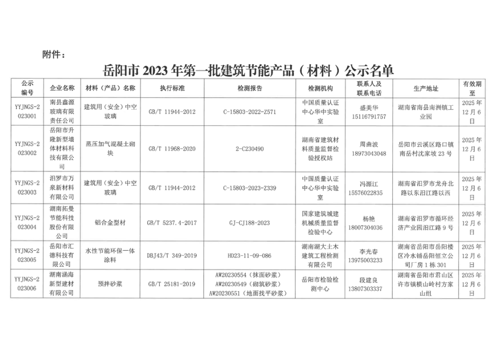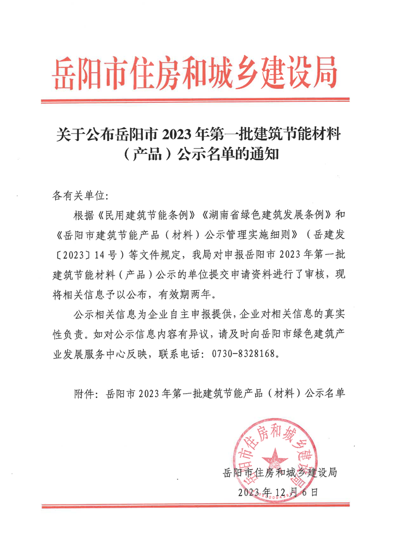 关于公布岳阳市2023年第一批建筑节能材料(产品)公示名单的通知