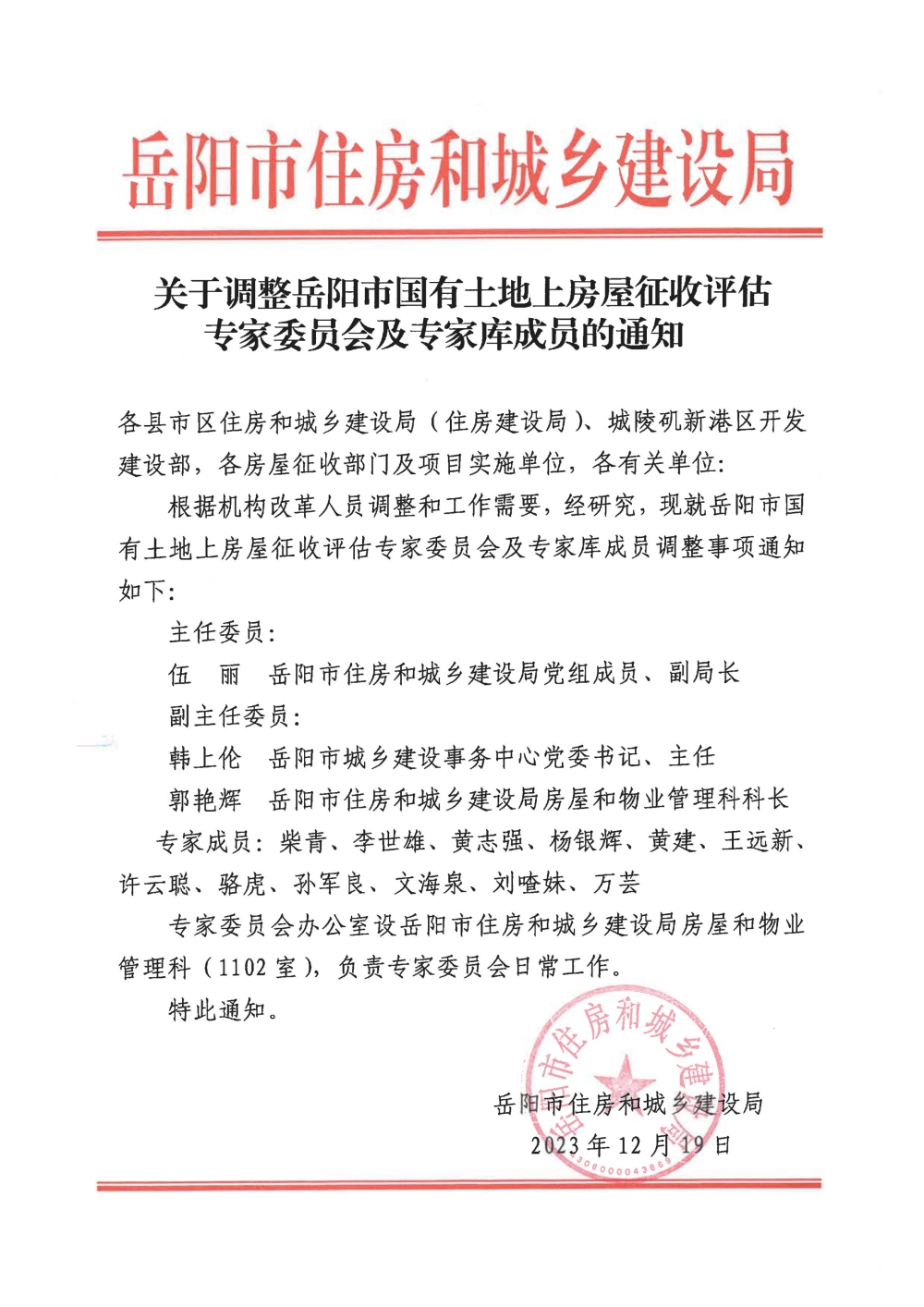 关于调整岳阳市国有土地上房屋征收评估专家委员会及专家库成员的通知