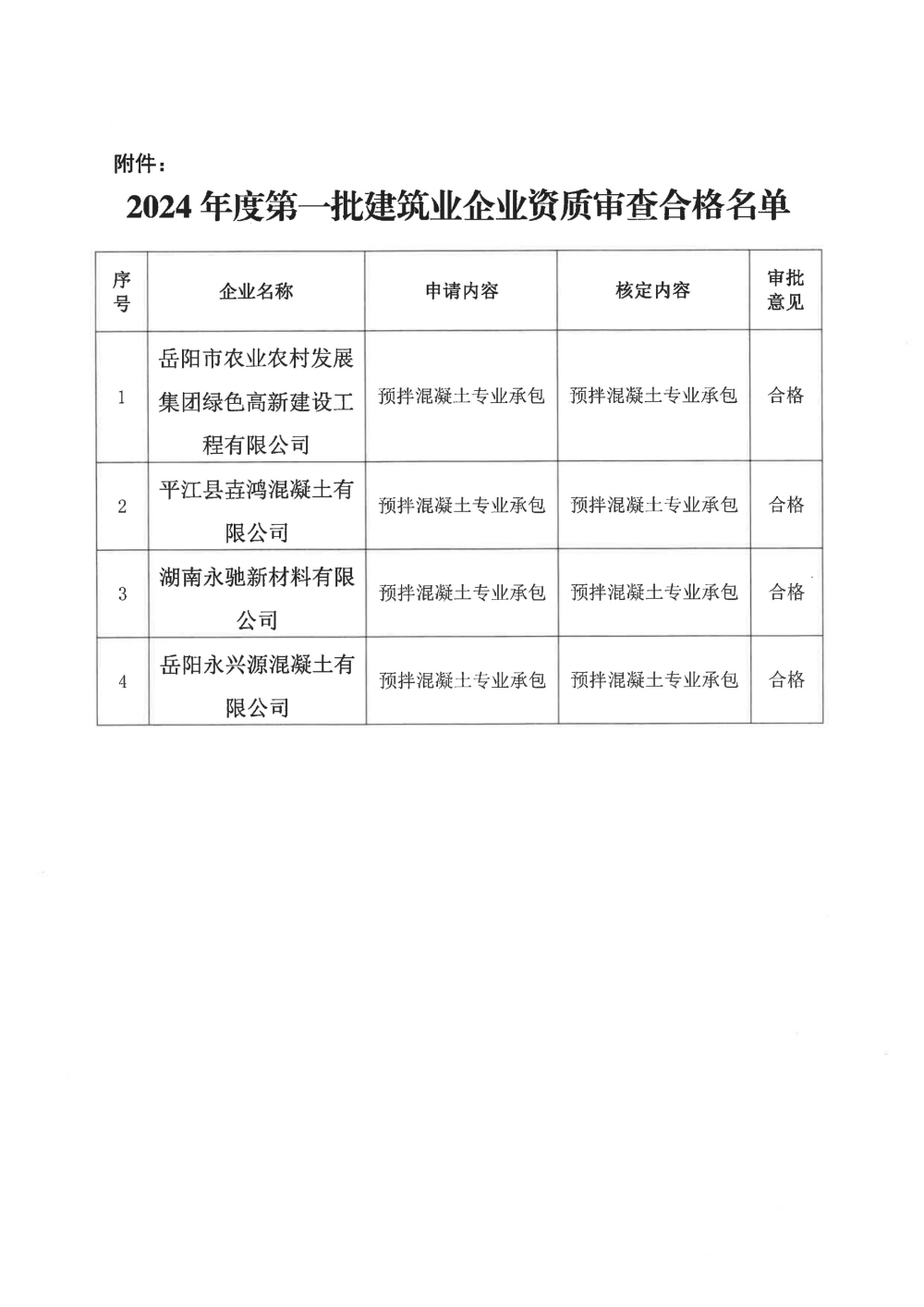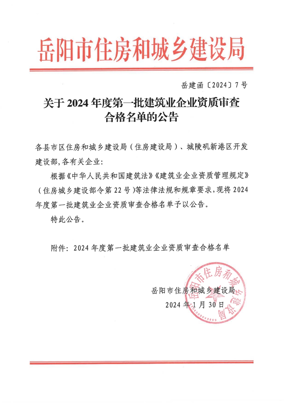 岳阳市住房和城乡建设局关于2024年度第一批建筑业企业资质审查合格名单的公告