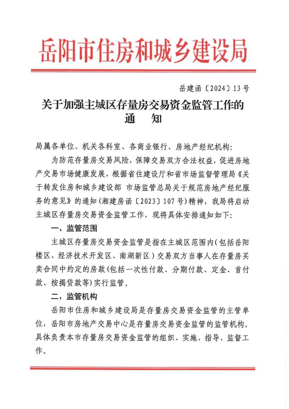 岳阳市住房和城乡建设局关于加强主城区存量房交易资金监管工作的通知