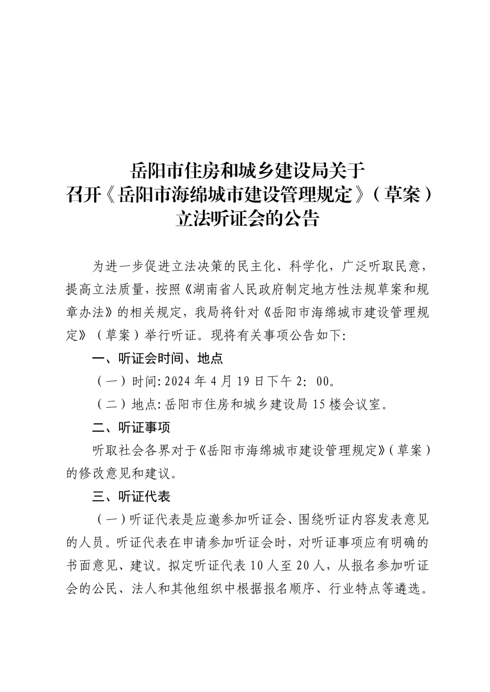 岳阳市住房和城乡建设局关于召开《岳阳市海绵城市建设管理规定》(草案)立法听证会的公告