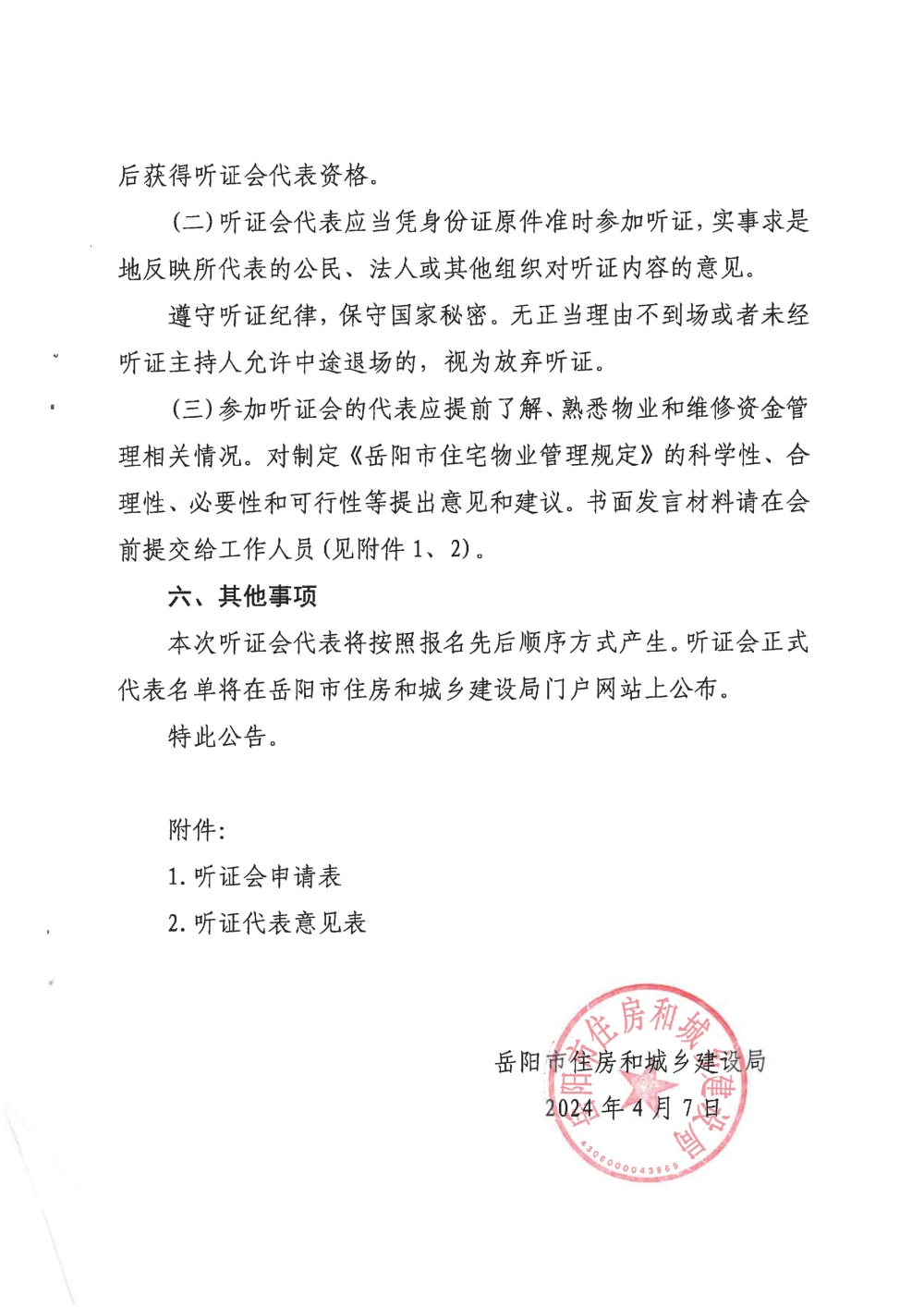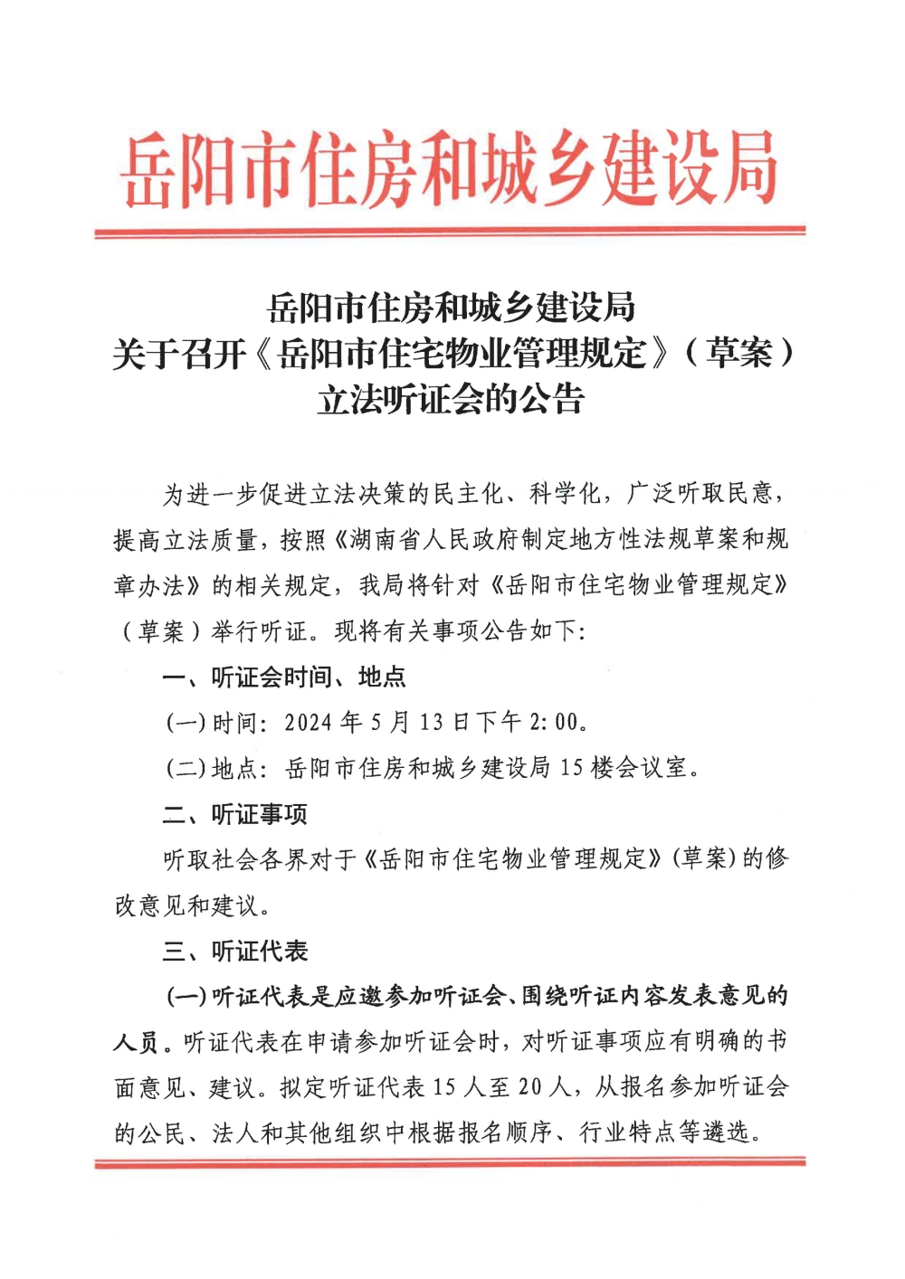 岳阳市住房和城乡建设局关于召开《岳阳市住宅物业管理规定》(草案)立法听证会的公告