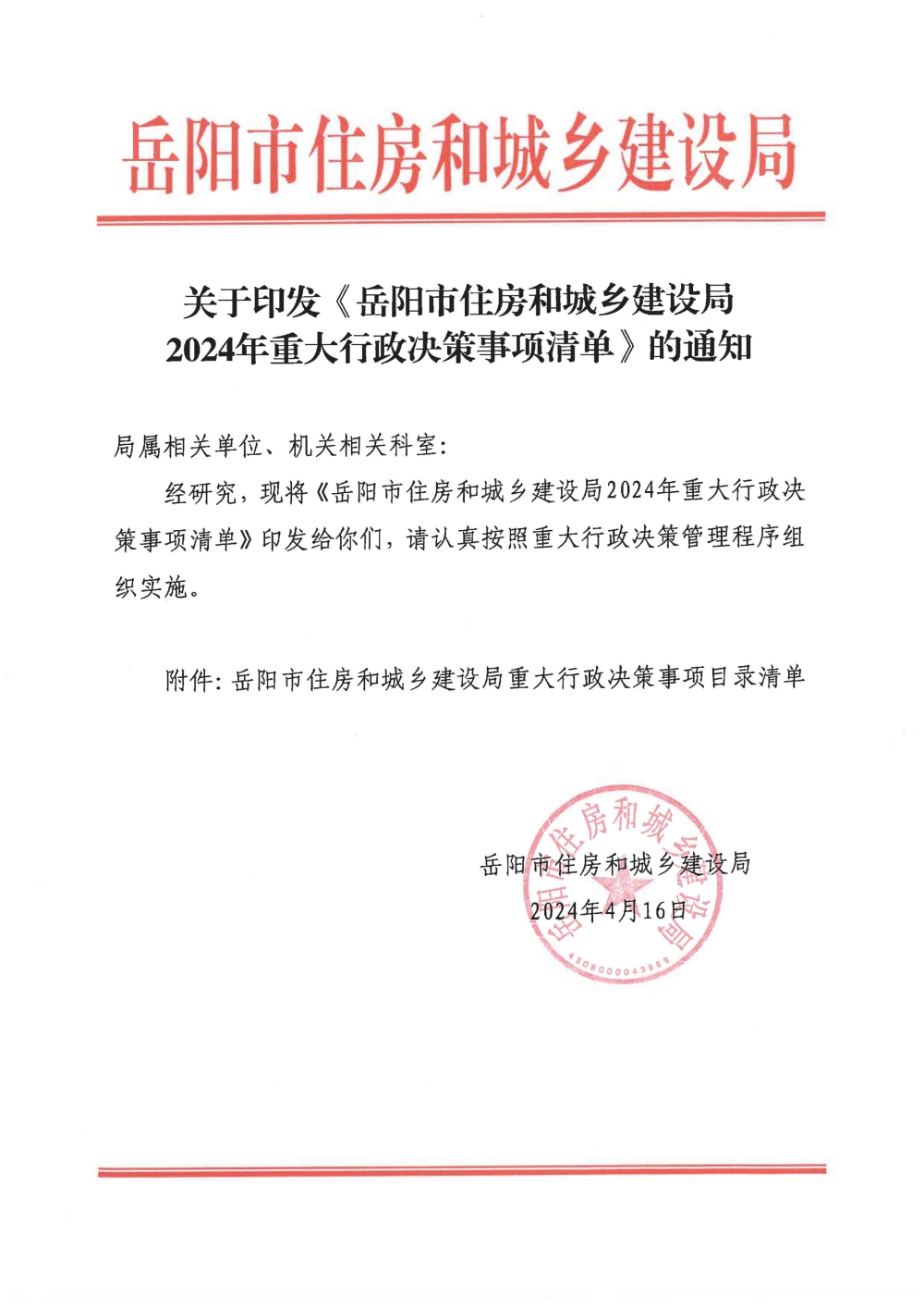 关于印发《岳阳市住房和城乡建设局2024年重大行政决策事项清单》的通知