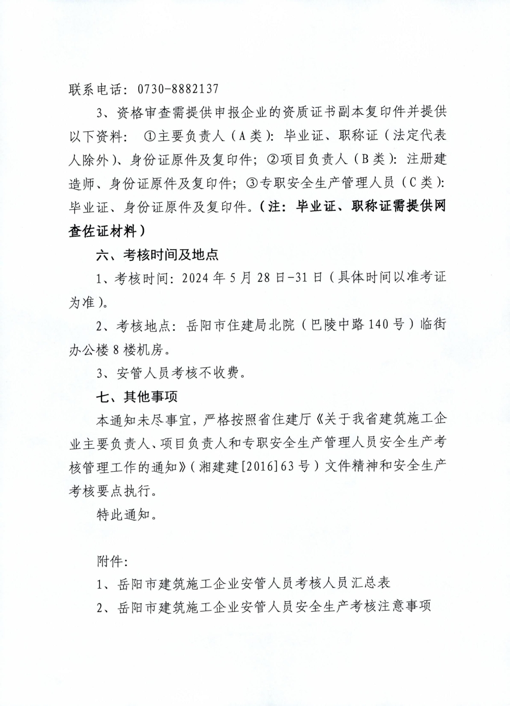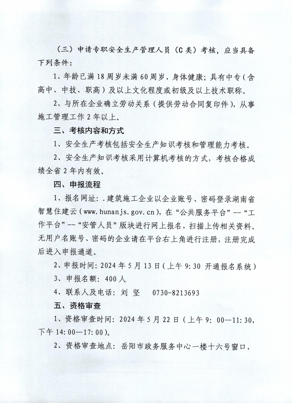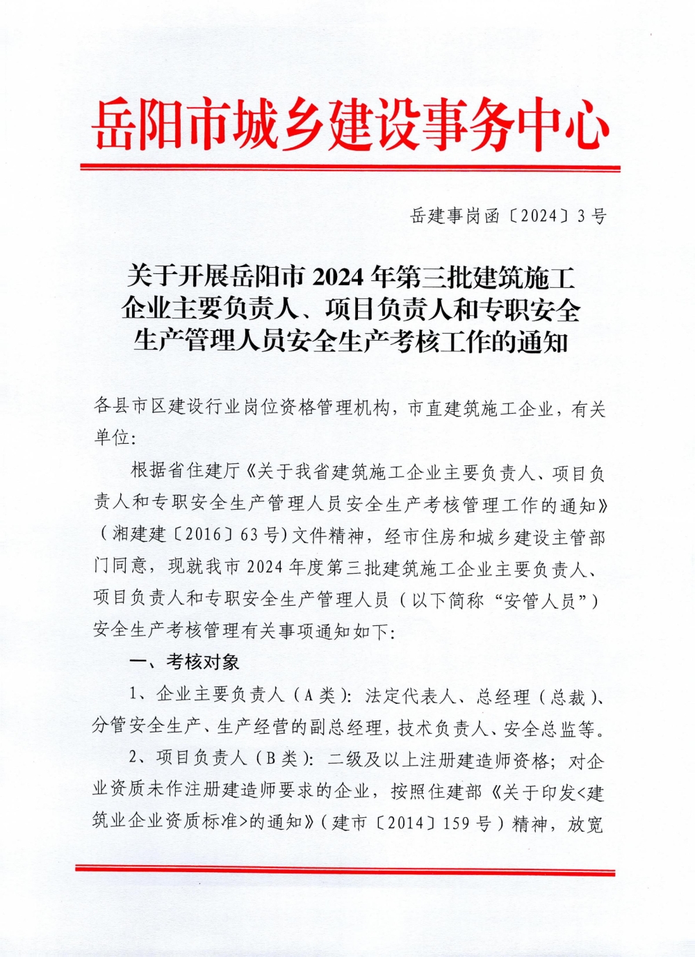 关于开展岳阳市2024年第三批建筑施工企业主要负责人、项目负责人和专职安全生产管理人员安全生产考核工作的通知