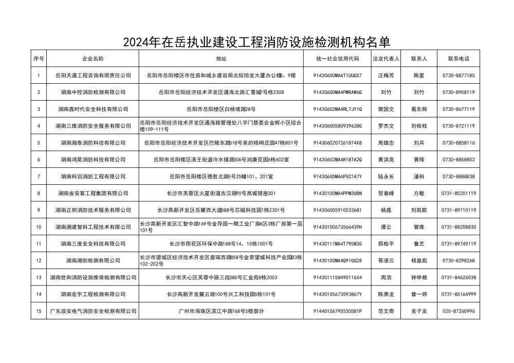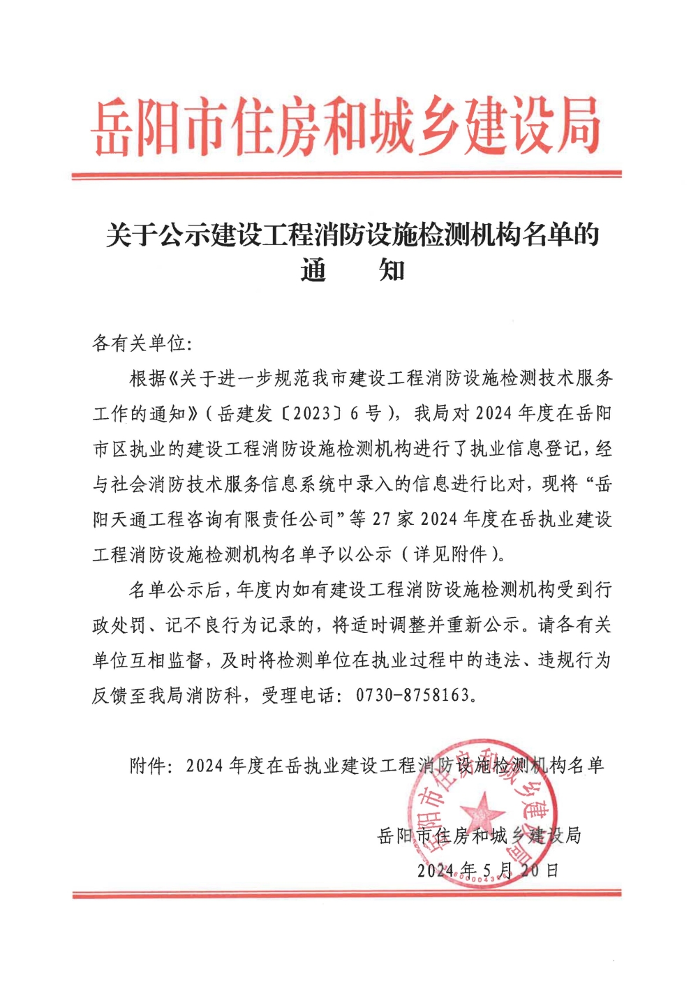 岳阳市住房和城乡建设局关于公示建设工程消防设施检测机构名单的通知