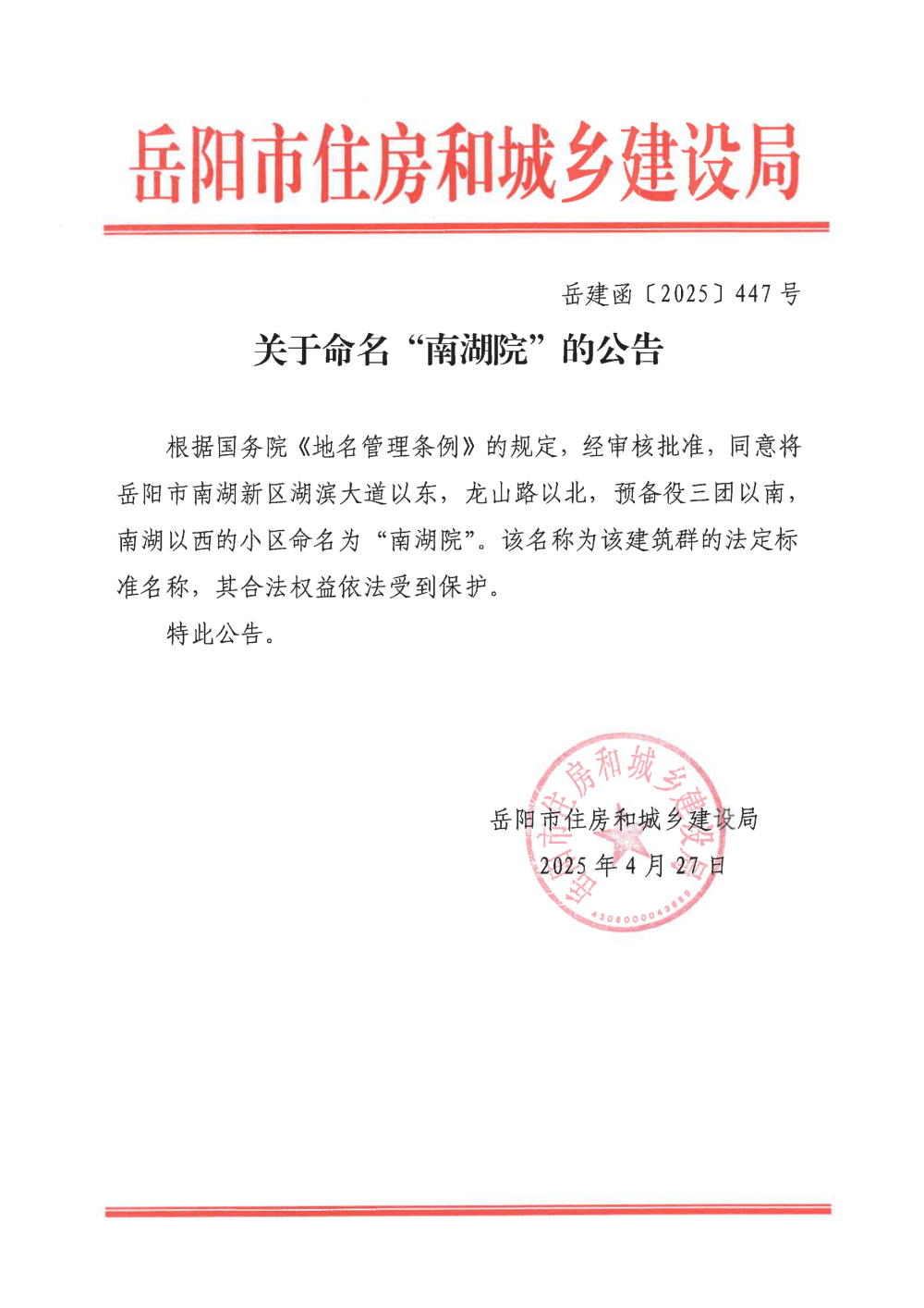 关于命名“南湖院”的公告