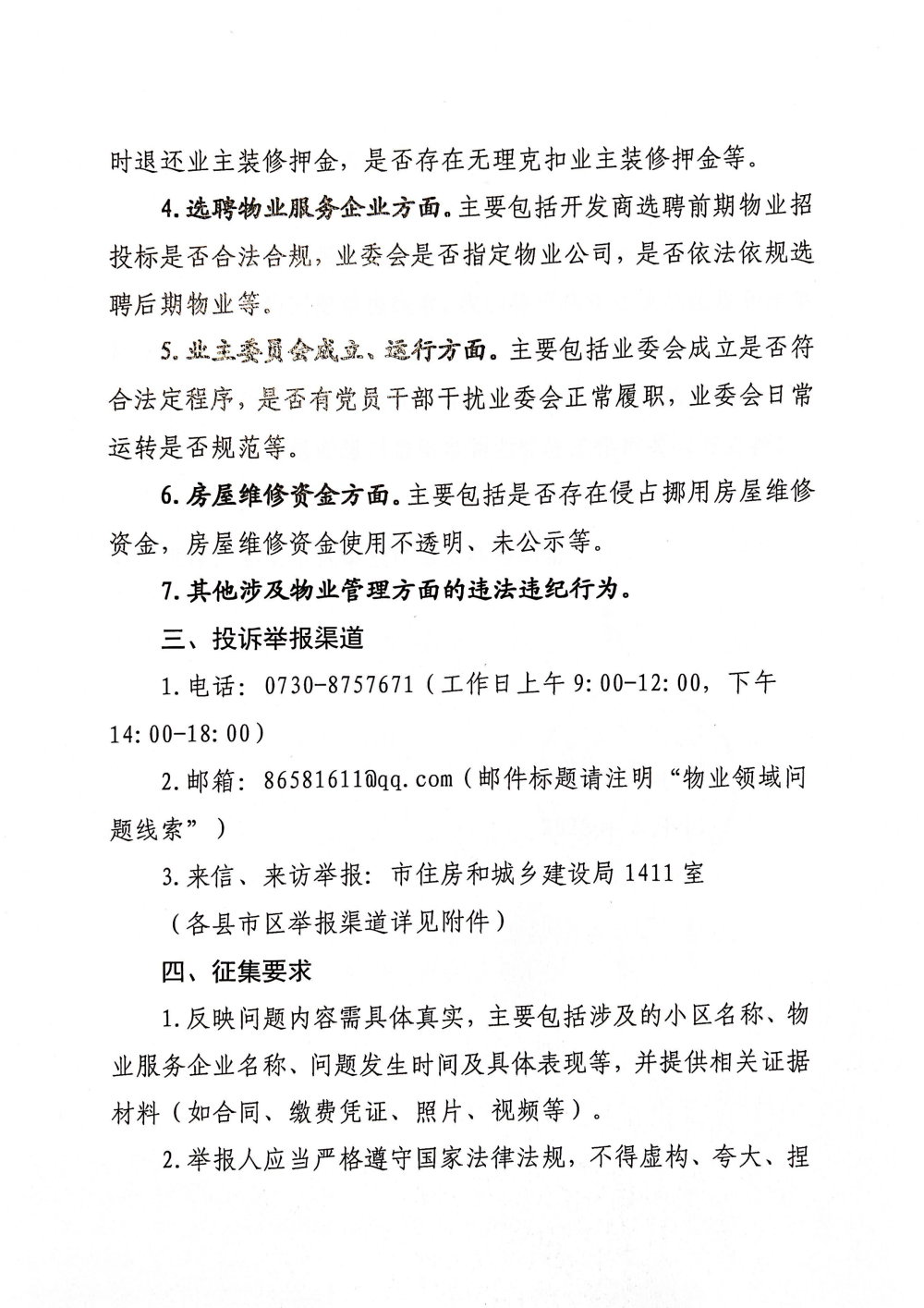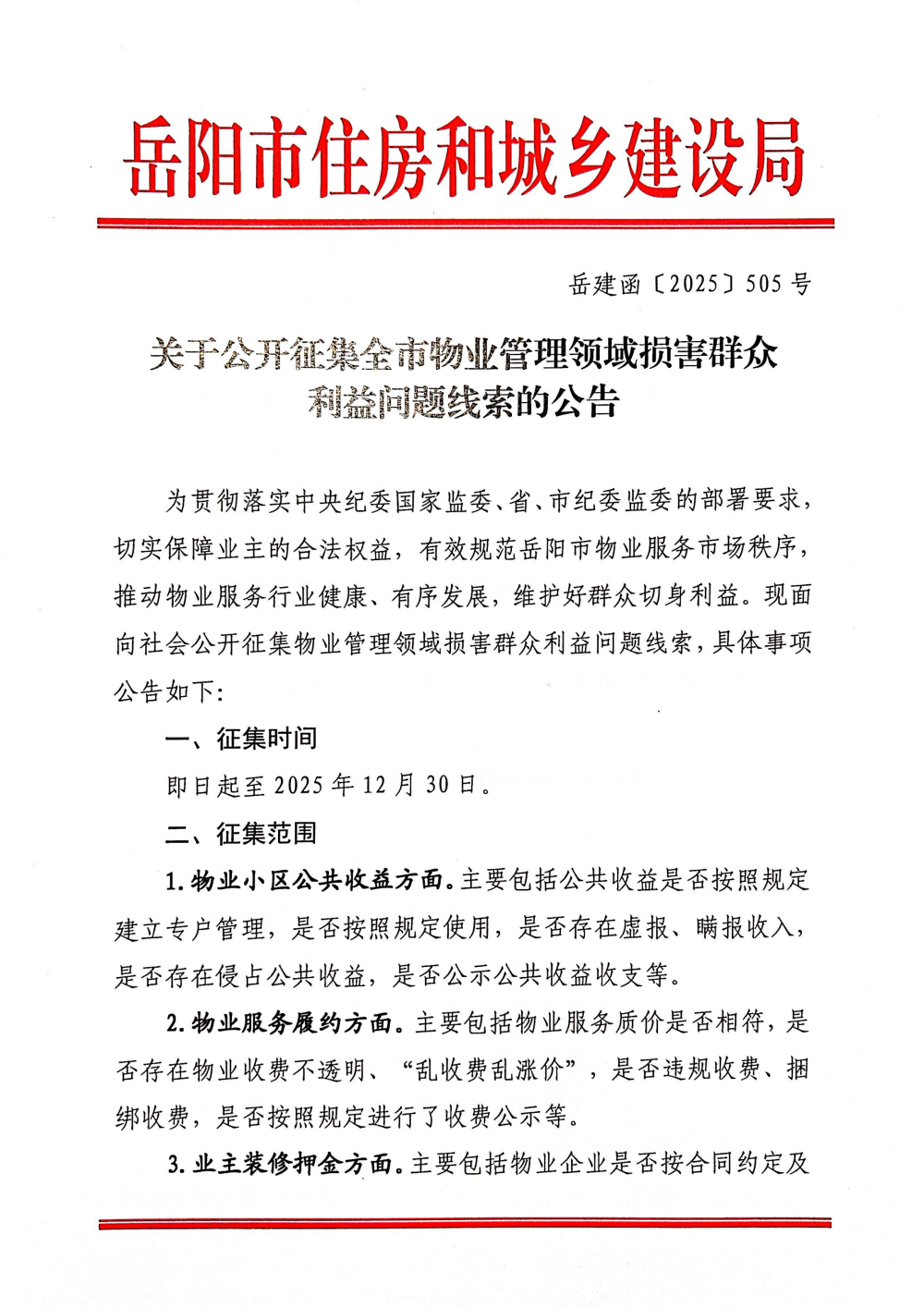 关于公开征集全市物业管理领域损害群众利益问题线索的公告