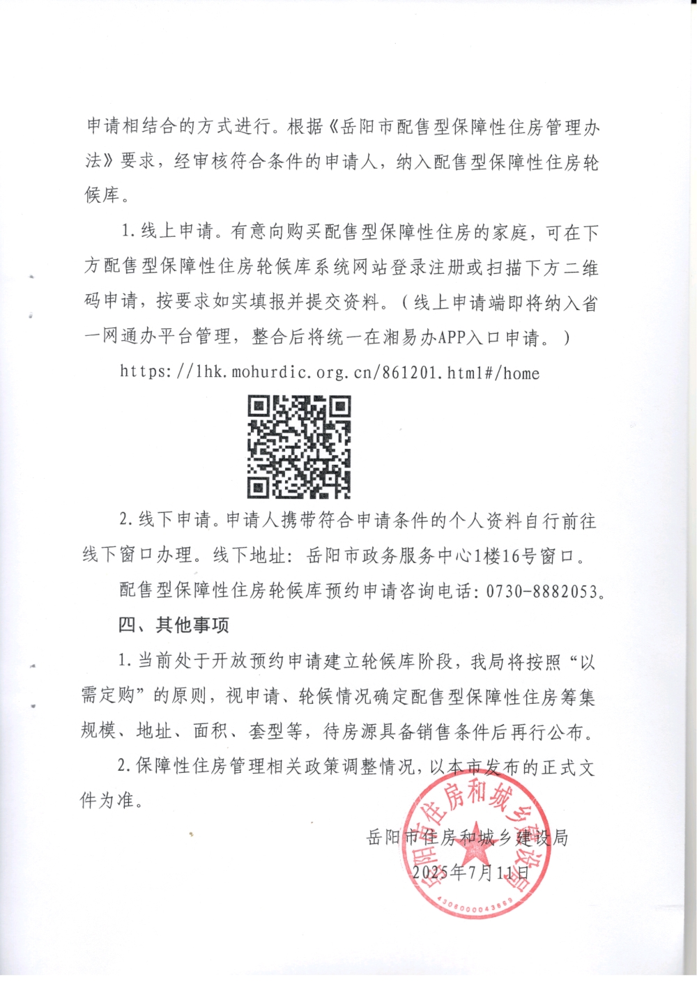 岳阳市住房和城乡建设局关于岳阳市城区配售型保障性住房轮候库开放预约申请的公告