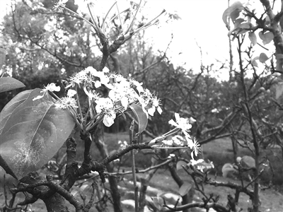 梨树“二次花”还有前期症状,主要表现就是“没叶子”。一般情况下,梨树正常落叶期在10月下旬至11月上旬,若叶片在7至8月早落,树体就会提前进入休眠状态。此时若遇上10月“小阳春”天气,梨树就会二次开花。前一段时间天气晴好,温度似“小阳春”,为开花创造了条件。不过,由于现在开花消耗了营养和能量,明年春天开花时,这些树肯定会比别的树开得少。