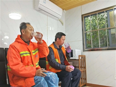 黄星球是城南环卫所求索队的一位环卫工人,已经扫地7年了。以前扫地累了,想休息没地方去,只能坐在马路边,下雨天还无处可去。现在好了,黄星球说:“干活累了能在这儿休息,舒服得就跟在家一样。”记者注意到,这处朝阳小学的环卫工人休息室就矗立在路边,敞亮的塑钢玻璃窗,米黄色的整体格局,再配上蔚蓝色“环卫工人休息室”的字样,使整个休息间显得清新亮丽、干净整洁。休息室内有桌椅、空调、饮水机、微波炉、储物柜等物品。